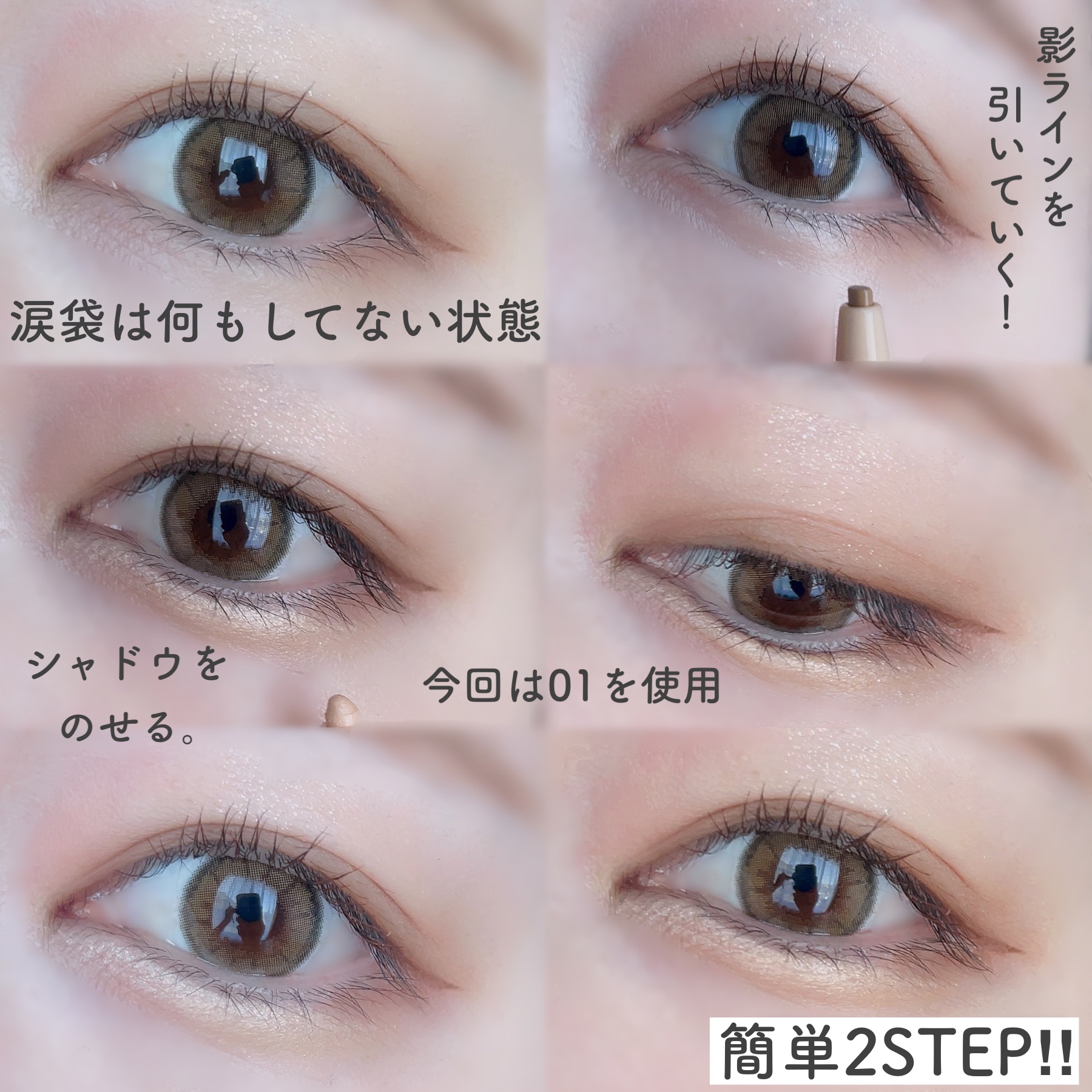 - 1.2色で簡単 涙袋完成 陰影ライナーで涙袋の影をサッと描いて 反対側のカラーシャドウで涙袋全体を埋めるだけで、 生まれつきの涙袋*のように ぷっくり自然な仕上がりに! 2. 粉飛びせずなめらかフィット 1回でスムーズに描ける柔らかい密着テクスチャー ムラなくヨレにくい、簡単にブレンディングできる クリームフォーミュラ 3. 描きやすい細芯タイプ 狭くて細い部位にも繊細なタッチでメイクが完成! 涙袋メイクに特化した #超繊細サイズ *メイクアップ効果による