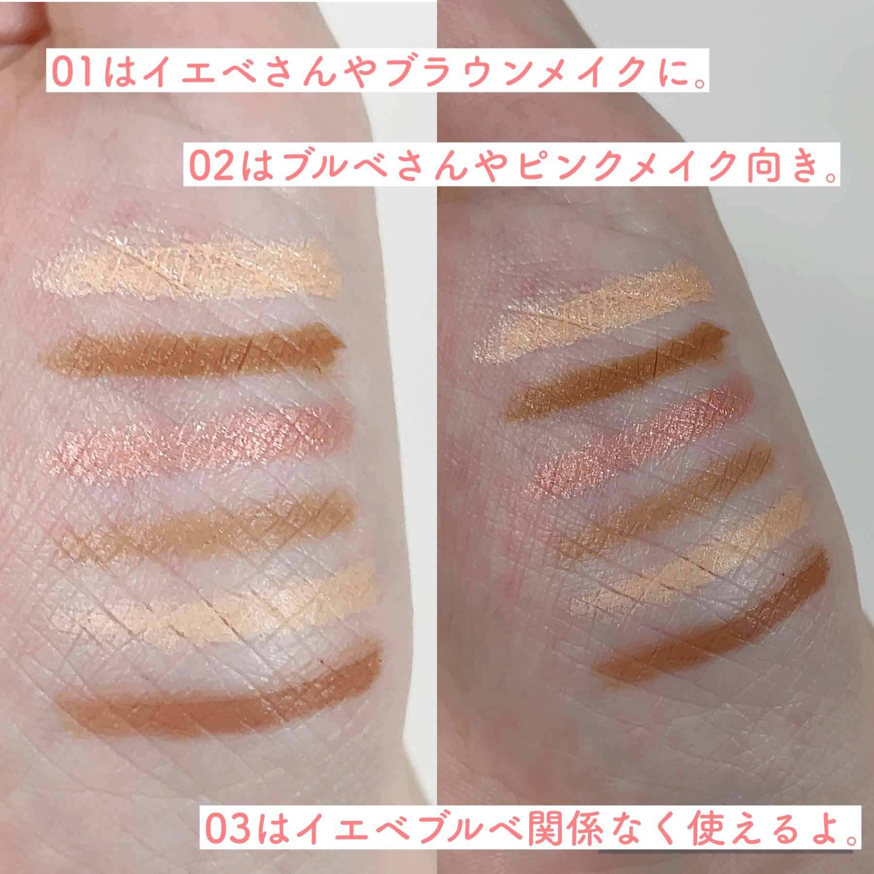 - <01 イエベ(WARM TONE)> COLOR エチルヘキサン酸アルキル(C12-15)、酸化チタン、ホウケイ酸(Ca/チタン)、フェニルトリメチコン、マイカ、トリイソステアリン酸ポリグリセリル-2、合成ワックス、キャンデリラロウ、合成フルオロフロゴパイト、モクロウ、(VP/ヘキサデセン)コポリマー、ポリイソブテン、酸化鉄、カルナウバロウ、ポリヒドロキシステアリン酸、カルミン、イソステアリン酸、パルミチン酸エチルヘキシル、ミリスチン酸イソプロピル、レシチン、酸化スズ、ポリリシノレイン酸ポリグリセリル-3、カプリリルグリコール、カプリル酸グリセリル SHADE 酸化チタン、酸化鉄、エチルヘキサン酸アルキル(C12-15)、フェニルトリメチコン、トリイソステアリン酸ポリグリセリル-2、合成ワックス、マイカ、キャンデリラロウ、(VP/ヘキサデセン)コポリマー、ポリイソブテン、カルナウバロウ、ポリヒドロキシステアリン酸、イソステアリン酸、パルミチン酸エチルヘキシル、ミリスチン酸イソプロピル、レシチン、ポリリシノレイン酸ポリグリセリル-3、カプリリルグリコール、カプリル酸グリセリル <02 ブルべ(COOL TONE)> COLOR エチルヘキサン酸アルキル(C12-15)、酸化チタン、マイカ、フェニルトリメチコン、トリイソステアリン酸ポリグリセリル-2、合成ワックス、ホウケイ酸(Ca/チタン)、キャンデリラロウ、合成フルオロフロゴパイト、酸化鉄、モクロウ、(VP/ヘキサデセン)コポリマー、ポリイソブテン、カルナウバロウ、ポリヒドロキシステアリン酸、カルミン、イソステアリン酸、パルミチン酸エチルヘキシル、ミリスチン酸イソプロピル、レシチン、ポリリシノレイン酸ポリグリセリル-3、カプリリルグリコール、カプリル酸グリセリル、酸化スズ SHADE 酸化チタン、エチルヘキサン酸アルキル(C12-15)、フェニルトリメチコン、トリイソステアリン酸ポリグリセリル-2、マイカ、合成ワックス、酸化鉄、キャンデリラロウ、(VP/ヘキサデセン)コポリマー、ポリイソブテン、カルナウバロウ、ポリヒドロキシステアリン酸、イソステアリン酸、パルミチン酸エチルヘキシル、ミリスチン酸イソプロピル、レシチン、ポリリシノレイン酸ポリグリセリル-3、カプリリルグリコール、カプリル酸グリセリル <03 リアル(REAL)> COLOR 酸化チタン、エチルヘキサン酸アルキル(C12-15)、フェニルトリメチコン、トリイソステアリン酸ポリグリセリル-2、合成ワックス、マイカ、キャンデリラロウ、酸化鉄、カルナウバロウ、(VP/ヘキサデセン)コポリマー、ポリイソブテン、ポリヒドロキシステアリン酸、イソステアリン酸、パルミチン酸エチルヘキシル、ミリスチン酸イソプロピル、レシチン、ポリリシノレイン酸ポリグリセリル-3、カプリリルグリコール、カプリル酸グリセリル SHADE 酸化チタン、エチルヘキサン酸アルキル(C12-15)、フェニルトリメチコン、トリイソステアリン酸ポリグリセリル-2、マイカ、酸化鉄、合成ワックス、キャンデリラロウ、(VP/ヘキサデセン)コポリマー、ポリイソブテン、カルナウバロウ、ポリヒドロキシステアリン酸、イソステアリン酸、パルミチン酸エチルヘキシル、ミリスチン酸イソプロピル、レシチン、ポリリシノレイン酸ポリグリセリル-3、カプリリルグリコール、カプリル酸グリセリル <07 ウォームピーチ(WARM PEACH)> COLOR エチルヘキサン酸アルキル(C12-15)、フェニルトリメチコン、酸化チタン、マイカ、ホウケイ酸(Ca/チタン)、トリイソステアリン酸ポリグリセリル-2、合成フルオロフロゴパイト、合成ワックス、キャンデリラロウ、モクロウ、酸化鉄、(VP/ヘキサデセン)コポリマー、ポリイソブテン、カルナウバロウ、ポリヒドロキシステアリン酸、ジメチコン、イソステアリン酸、パルミチン酸エチルヘキシル、ミリスチン酸イソプロピル、レシチン、(ビニルジメチコン/メチコンシルセスキオキサン)クロスポリマー、酸化スズ、ポリリシノレイン酸ポリグリセリル-3、トリエトキシカプリリルシラン、カプリリルグリコール、カプリル酸グリセリル SHADE 酸化チタン、エチルヘキサン酸アルキル(C12-15)、フェニルトリメチコン、マイカ、トリイソステアリン酸ポリグリセリル-2、合成ワックス、酸化鉄、キャンデリラロウ、(VP/ヘキサデセン)コポリマー、ポリイソブテン、カルナウバロウ、ポリヒドロキシステアリン酸、ジメチコン、イソステアリン酸、パルミチン酸エチルヘキシル、ミリスチン酸イソプロピル、レシチン、(ビニルジメチコン/メチコンシルセスキオキサン)クロスポリマー、ポリリシノレイン酸ポリグリセリル-3、カプリリルグリコール、カプリル酸グリセリル