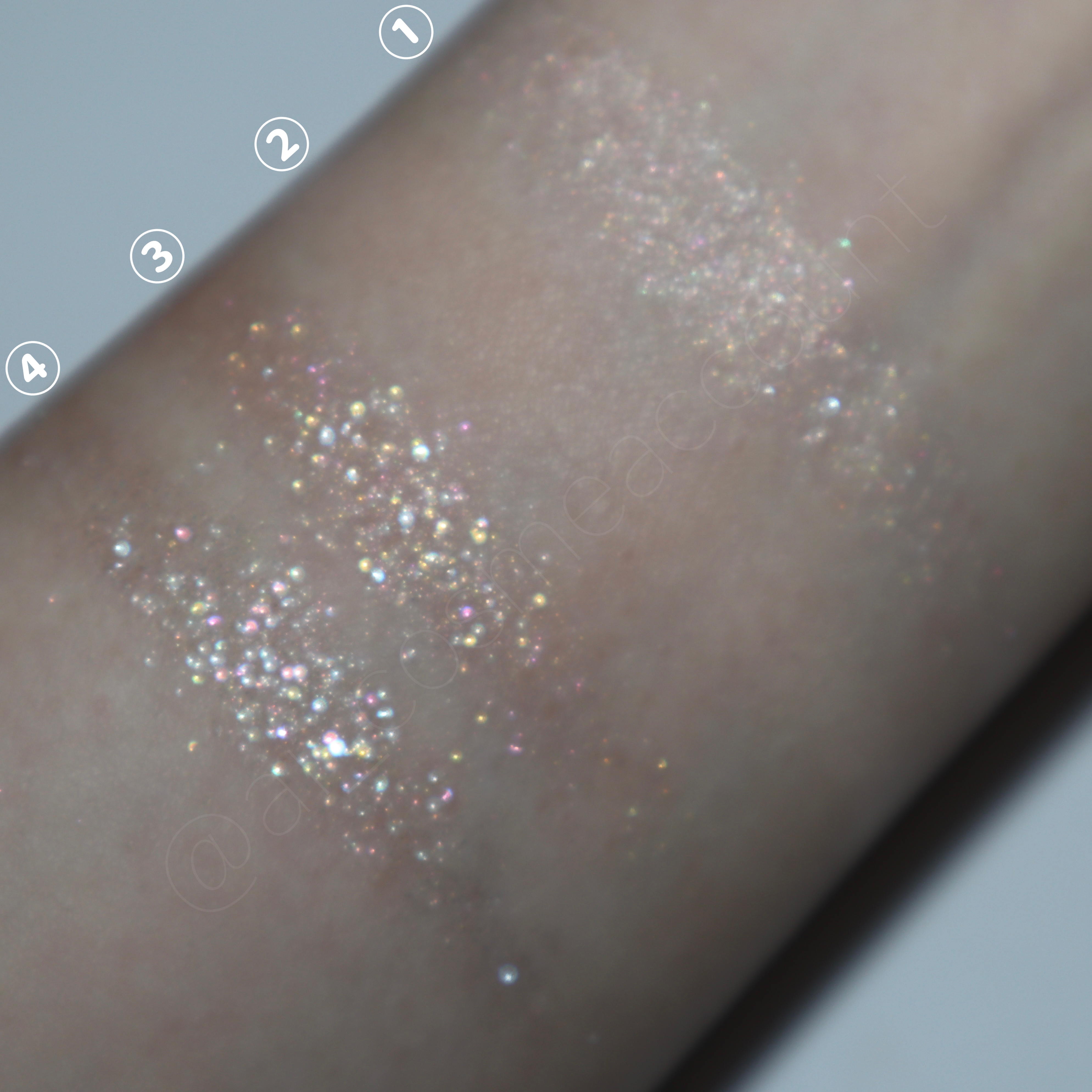 S[SHINY]“高輝度ガラスパール×カラーパールの美しいきらめき”↓S01.ピュアブロンズ“上品に艶めくブロンズゴールド” R[RICH]“リッチな高発色と繊細なツヤで色遊びを楽しめる”↓R01.バニラムスク“光を集めるハイライトベージュ” F[FLUFFY]“ふんわり・しっとりの新感覚 肌と同化するセミマット”↓F01.ラストナイト“血色感を潜ませるメロウなピンク”