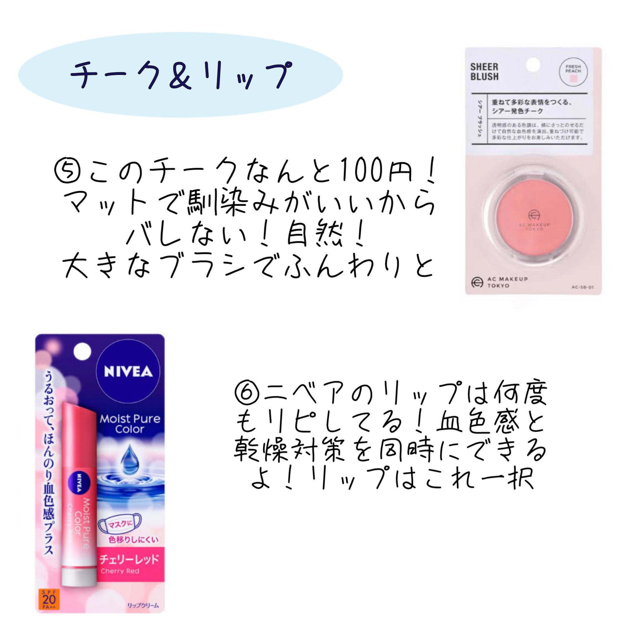 私が実際にやっているスクールメイクについて紹介します。 ビオレUV アクアリッチ ウォータリージェル 資生堂ベビーパウダー キャンメイクアイバッグコンシーラー CEZANNEノーズ&アイブロウパウダー セリアのチーク ニベアモイストピュアカラーリップ 何よりも薄く薄くすることを意識しています!