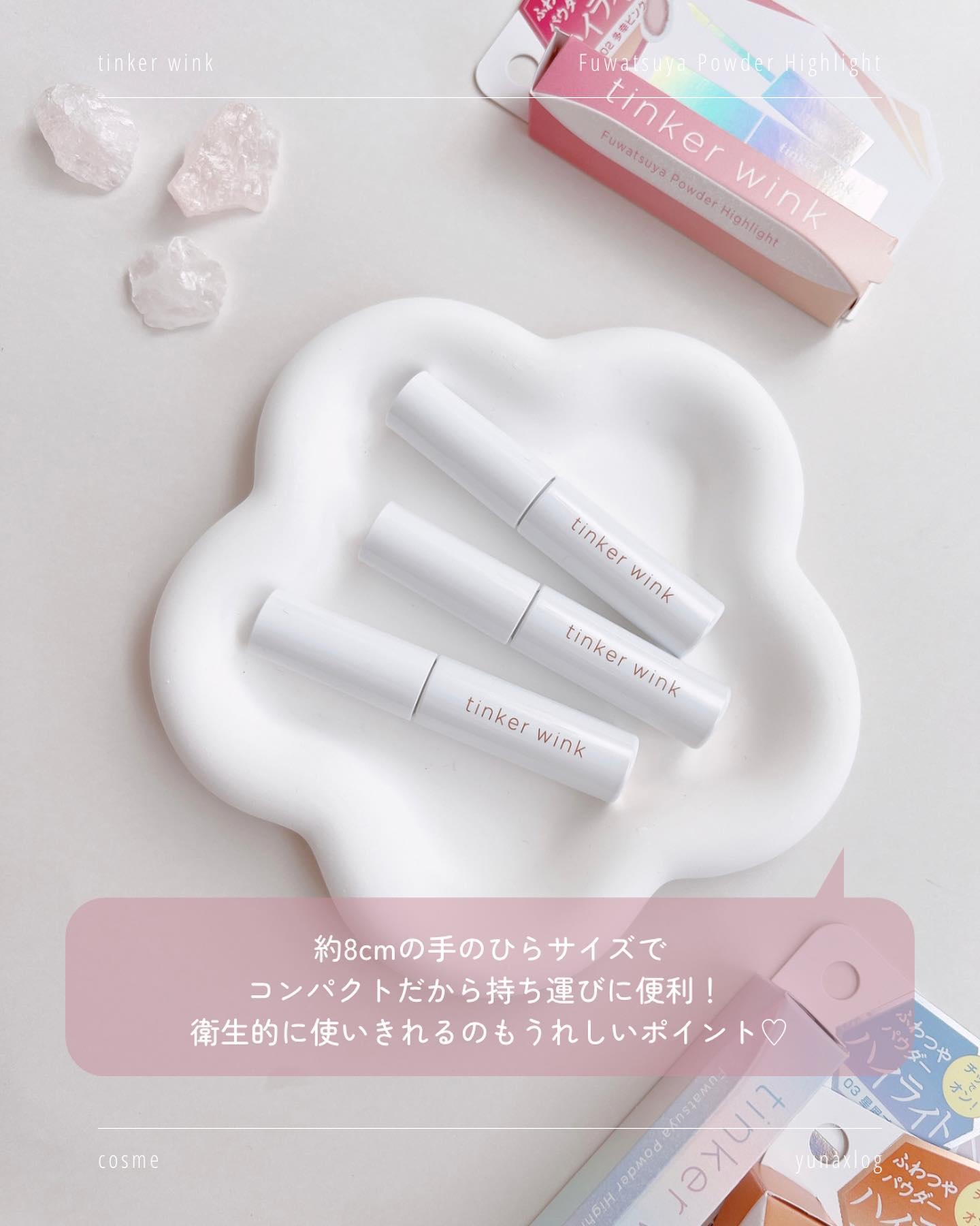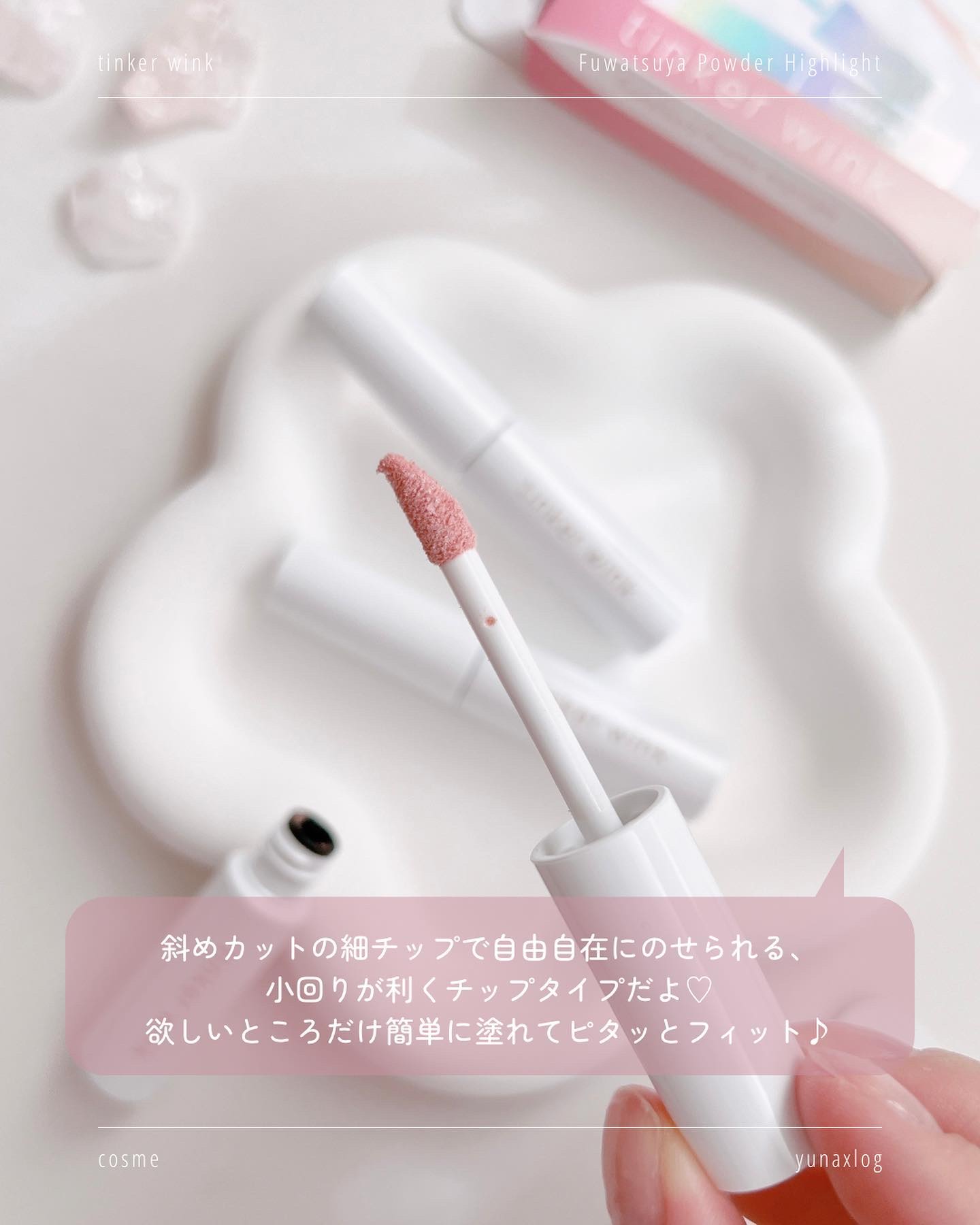 ティンカーウィンクふわつやパウダーハイライト02多幸ピンク珍しい、チップで取るタイプのハイライト。中身はパウダーですが、しっとりしていて肌に塗ると密着してなじみます。少なめに塗ると自然に肌が輝いて見え、多めに塗るとキラッキラでめちゃくちゃ可愛...