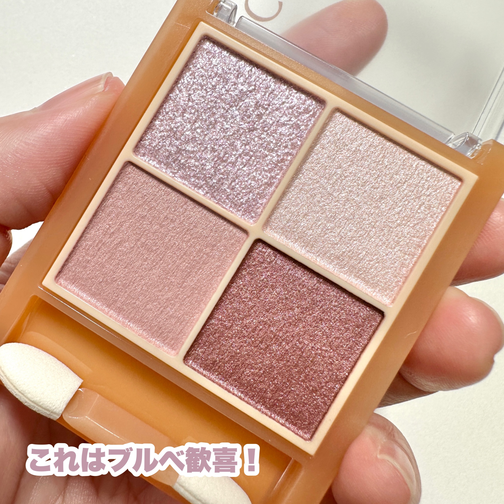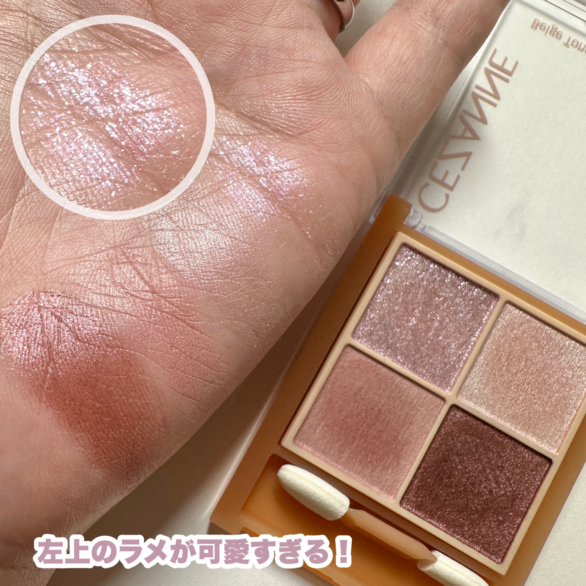 - ラメ・パール・マット3質感の4色アイシャドウ。 肌馴染みの良いベージュを基調としたカラー。ラメ・パール・マットの3質感を重ねて、自然にまぶたを強調し奥行のある大きな目元へ。 しっとり溶け込むような柔らかなパウダーなので、スルスル伸びてまぶたにピタッと密着。保湿成分(スクワラン・ホホバ種子油)配合。