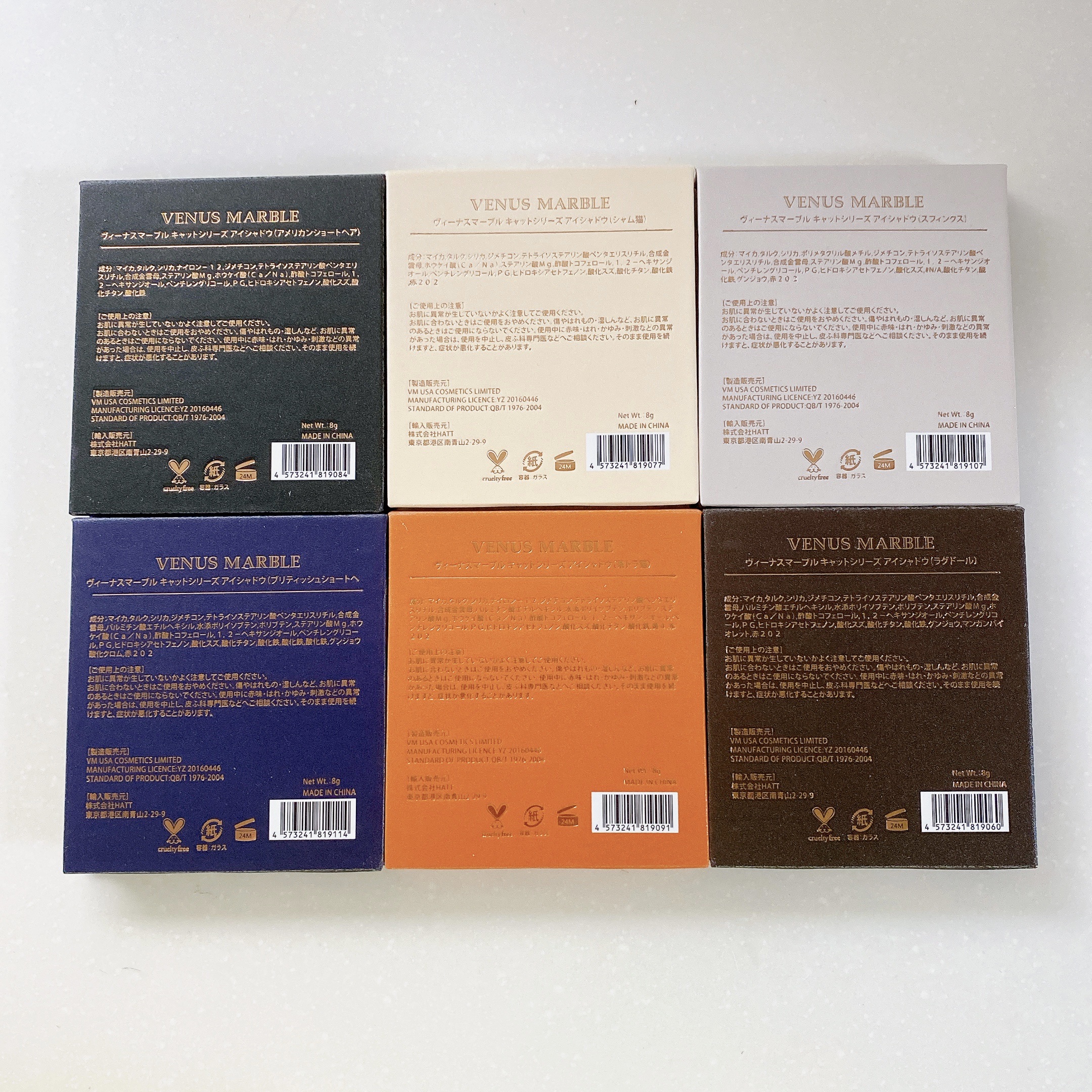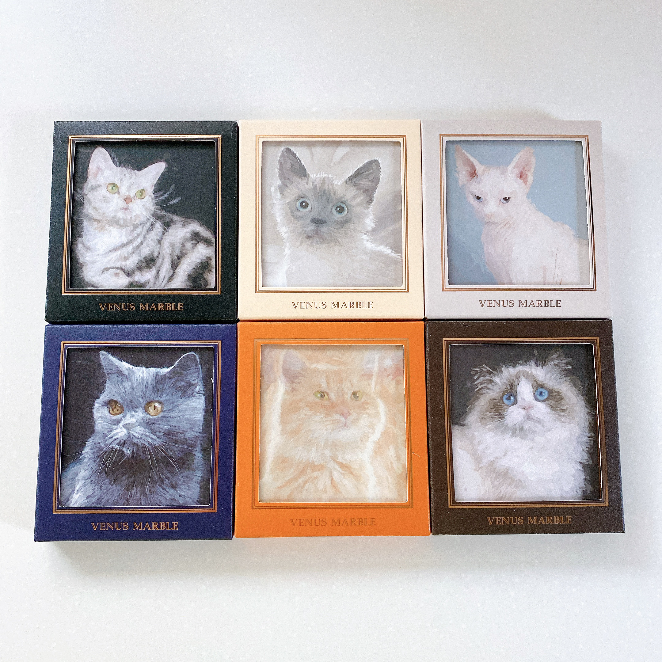 Venus Marble アイシャドウキャットシリーズ ⚪︎ブリティッシュロングヘア ⚪︎ベンガルキャット ⚪︎茶トラ猫 どれも発色がやたら強くて、自分の場合は化粧が濃く派手になり中国雑技団のようになります🤸 ミラー付き、マグネットで閉めるタイプで、マジョマ△⚪︎みたいな紙ケースでそれより1.5倍程大きい。