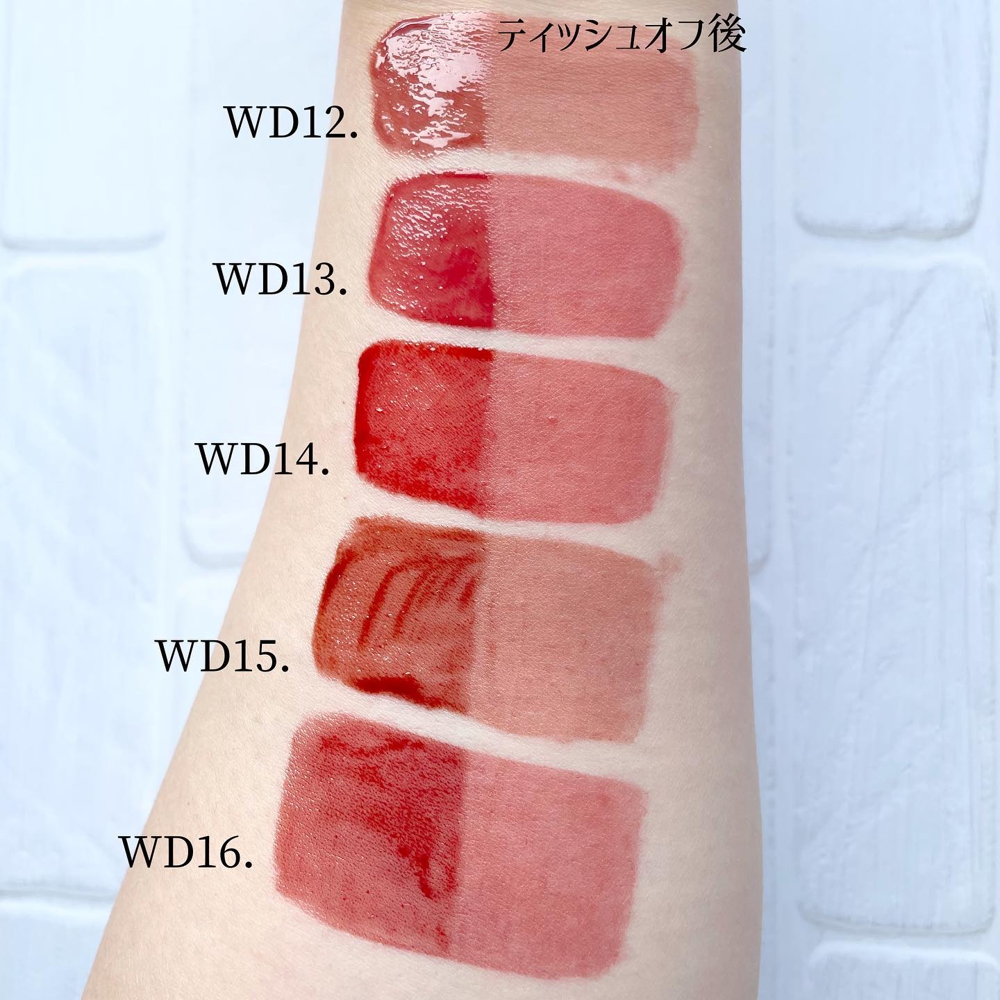 - <WD2 ビトゥン ローズ> 水、ジフェニルジメチコン、リンゴ酸ジイソステアリル、ビスジグリセリルポリアシルアジペート-2、水添ポリイソブテン、ジグリセリン、DPG、セチルPEG/PPG-10/1ジメチコン、イソステアリン酸ソルビタン、ポリソルベート60、ペンチレングリコール、オクチルドデカノール、セテアレス-20、(アクリル酸ヒドロキシエチル/アクリロイルジメチルタウリンNa)コポリマー、スクワラン、フェノキシエタノール、ポリグリセリン-3、ステビオシド、香料、エチルヘキシルグリセリン、グリセリン、シア脂、ツバキ種子油、トリ(カプリル酸/カプリン酸)グリセリル、アルガニアスピノサ核油、ホホバ種子油、アーモンド油、アンズ核油、月見草油、オリーブ果実油、テトラ(ジ-t-ブチルヒドロキシヒドロケイヒ酸)ペンタエリスリチル、カニナバラ果実エキス、マンゴー果実エキス、赤104(1)、赤227、黄5、青1 <WD3 ピンク ヘイズ> 水、ジフェニルジメチコン、リンゴ酸ジイソステアリル、ビスジグリセリルポリアシルアジペート-2、水添ポリイソブテン、ジグリセリン、DPG、セチルPEG/PPG-10/1ジメチコン、イソステアリン酸ソルビタン、ポリソルベート60、ペンチレングリコール、オクチルドデカノール、セテアレス-20、(アクリル酸ヒドロキシエチル/アクリロイルジメチルタウリンNa)コポリマー、スクワラン、フェノキシエタノール、ポリグリセリン-3、ステビオシド、香料、エチルヘキシルグリセリン、グリセリン、水酸化Al、ポリアクリル酸アンモニウム、BG、アルガニアスピノサ核油、シア脂、ツバキ種子油、トリ(カプリル酸/カプリン酸)グリセリル、アーモンド油、アンズ核油、ホホバ種子油、月見草油、オリーブ果実油、テトラ(ジ-t-ブチルヒドロキシヒドロケイヒ酸)ペンタエリスリチル、マンゴー果実エキス、カニナバラ果実エキス、酸化チタン、赤104(1)、赤227、黄5、青1 <WD4 オールウェイズ ヤング> 水、ジフェニルジメチコン、リンゴ酸ジイソステアリル、ビスジグリセリルポリアシルアジペート-2、水添ポリイソブテン、ジグリセリン、DPG、セチルPEG/PPG-10/1ジメチコン、イソステアリン酸ソルビタン、ポリソルベート60、ペンチレングリコール、オクチルドデカノール、セテアレス-20、(アクリル酸ヒドロキシエチル/アクリロイルジメチルタウリンNa)コポリマー、スクワラン、フェノキシエタノール、ポリグリセリン-3、ステビオシド、香料、エチルヘキシルグリセリン、グリセリン、シア脂、ツバキ種子油、トリ(カプリル酸/カプリン酸)グリセリル、アルガニアスピノサ核油、ホホバ種子油、アーモンド油、アンズ核油、月見草油、オリーブ果実油、テトラ(ジ-t-ブチルヒドロキシヒドロケイヒ酸)ペンタエリスリチル、カニナバラ果実エキス、マンゴー果実エキス、赤104(1)、赤227、黄5、青1 <WD6 クラッシュド パンプキン> 水、水添ポリイソブテン、リンゴ酸ジイソステアリル、ビスジグリセリルポリアシルアジペート-2、ジフェニルシロキシフェニルトリメチコン、ジフェニルジメチコン、ポリグリセリン-3、オクチルドデカノール、ポリソルベート60、セチルPEG/PPG-10/1ジメチコン、ラウリン酸ポリグリセリル-10、ペンチレングリコール、1,2-ヘキサンジオール、(アクリル酸ヒドロキシエチル/アクリロイルジメチルタウリンNa)コポリマー、PEG-60水添ヒマシ油、セテアリルアルコール、スクワラン、キシリトール、エチルヘキシルグリセリン、香料、ポリアクリル酸アンモニウム、イソステアリン酸ソルビタン、水酸化Al、フェノキシエタノール、BG、トコフェロール、酸化チタン、酸化鉄、赤227、黄4、黄5、青1 <WD8 ビンテージ カラント> 水、水添ポリイソブテン、リンゴ酸ジイソステアリル、ビスジグリセリルポリアシルアジペート-2、ジフェニルシロキシフェニルトリメチコン、ジフェニルジメチコン、オクチルドデカノール、ポリグリセリン-3、ポリソルベート60、セチルPEG/PPG-10/1ジメチコン、ラウリン酸ポリグリセリル-10、1,2-ヘキサンジオール、ペンチレングリコール、(アクリル酸ヒドロキシエチル/アクリロイルジメチルタウリンNa)コポリマー、PEG-60水添ヒマシ油、セテアリルアルコール、スクワラン、キシリトール、エチルヘキシルグリセリン、香料、イソステアリン酸ソルビタン、トコフェロール、赤104(1)、赤227、黄5、青1 <WD9 ミスター ストレンジャー> 水、水添ポリイソブテン、リンゴ酸ジイソステアリル、ビスジグリセリルポリアシルアジペート-2、ジフェニルシロキシフェニルトリメチコン、ジフェニルジメチコン、オクチルドデカノール、ポリグリセリン-3、ポリソルベート60、セチルPEG/PPG-10/1ジメチコン、ラウリン酸ポリグリセリル-10、1,2-ヘキサンジオール、ペンチレングリコール、(アクリル酸ヒドロキシエチル/アクリロイルジメチルタウリンNa)コポリマー、セテアリルアルコール、PEG-60水添ヒマシ油、スクワラン、キシリトール、エチルヘキシルグリセリン、香料、イソステアリン酸ソルビタン、水酸化Al、ポ