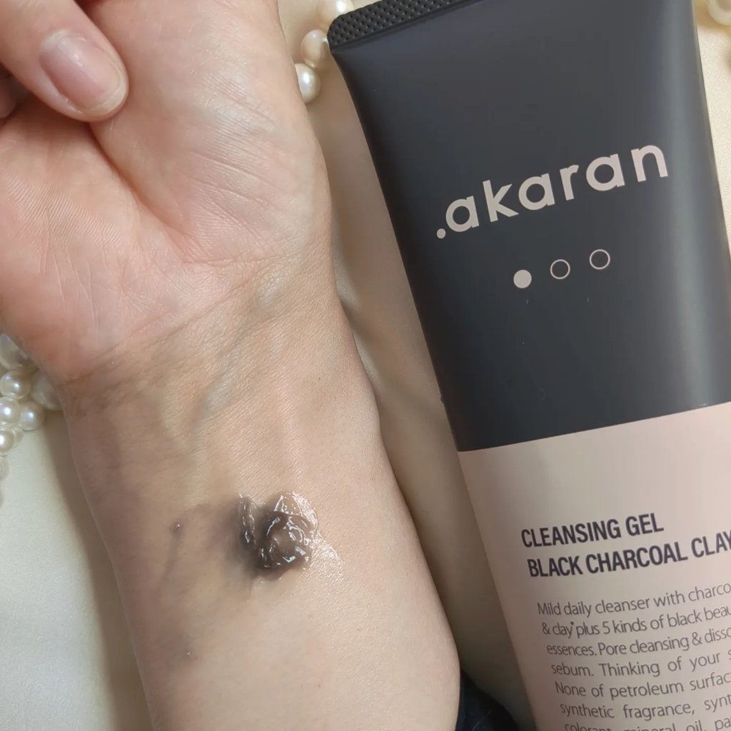 🖤.akaranブラックジェルクレンジングブラックのクッションジェルと毛穴1/33の炭とクレイがメイク汚れ・毛穴・黒ずみ・角栓・角質をつるっとオフ🖤ジェルはクッション性のある重ためのテクスチャーで、摩擦を抑えて洗い上がりはしっとり濡れ...