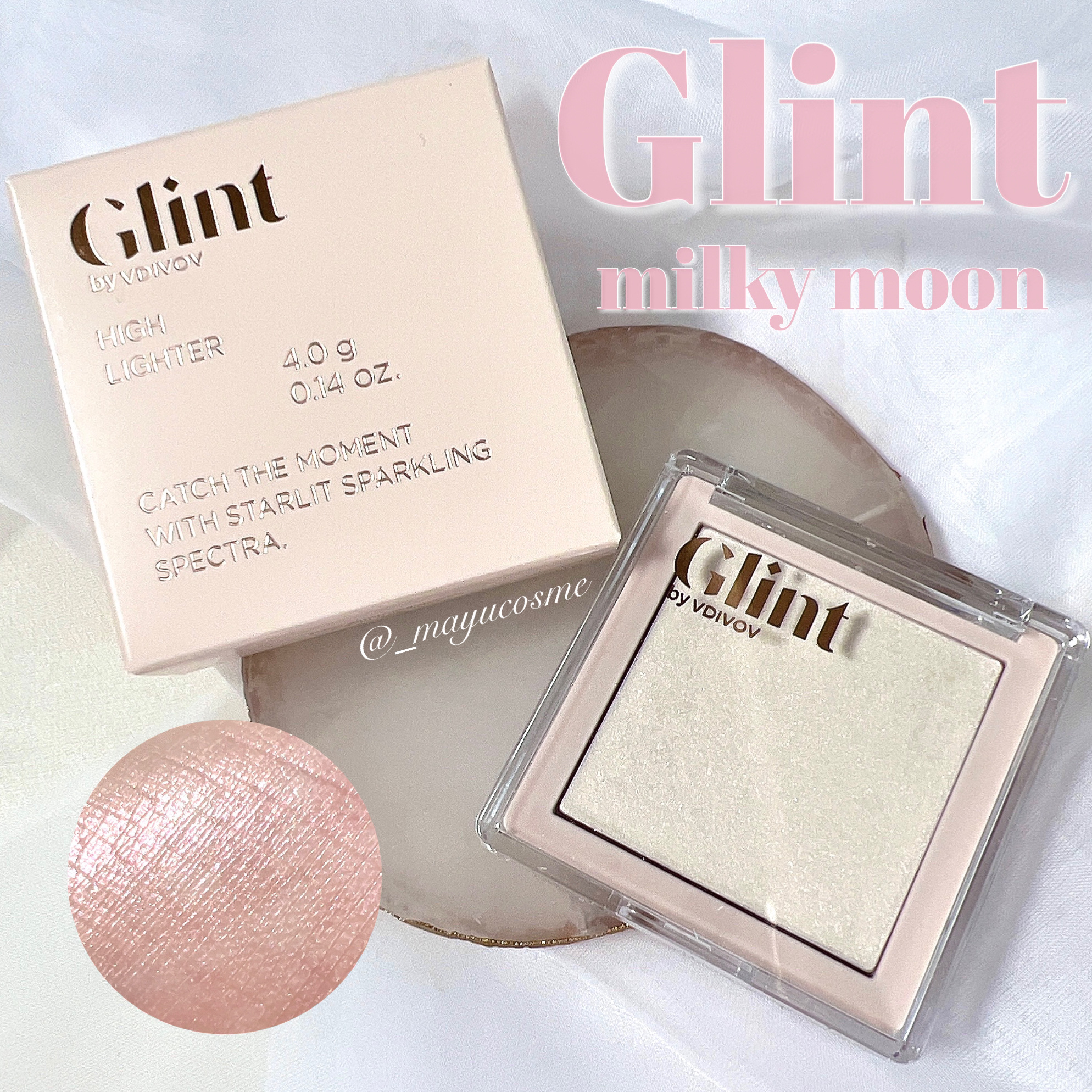 Glintの人気ハイライトとチークをスウォッチしたよ🌸🌸🌸🥰Glint グリントハイライター01DewyMoon/03ChromeBaby/04MilkyMoon/05PitchMoon/AngelPeach(新作)ベイクドブラッシュ04Tu...