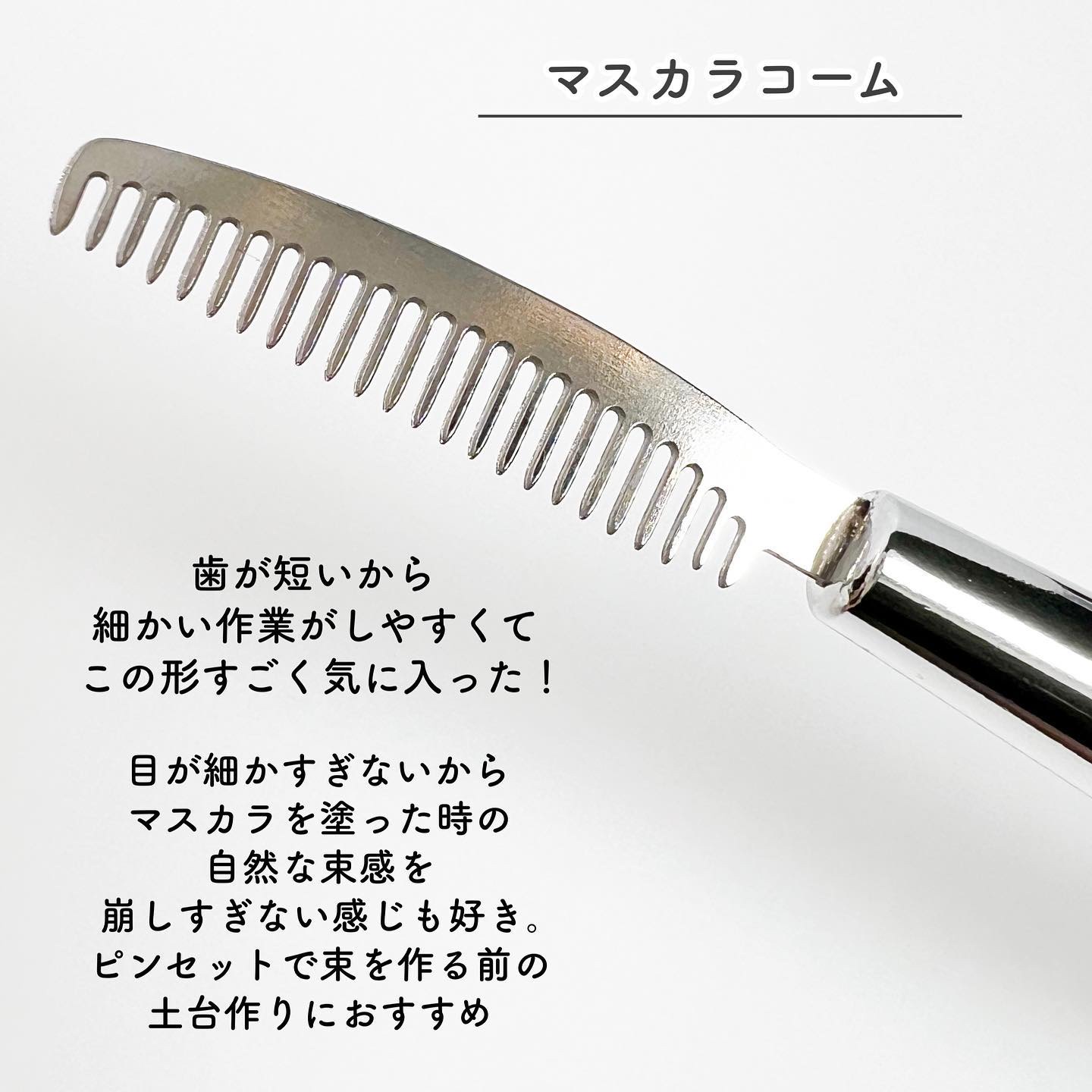 私は自まつ毛の密度が結構高めだから束感つけまつ毛を付けても束感が出にくくて 仕上げに結構コツがいるのですが、 これを使うとテクいらずで簡単に束感が出せます。 黒いマスカラをピンセットに着けて束感を作ると ちょっと毛先が重くなるのが気になるのですが、 クリアならボテっと重くならない所もすごく気に入ってます。 まつ毛同士が自然にくっついて束感ができてくれるから あとはスクリューブラシとピンセットで軽く整えると 束感作りが苦手な方も簡単にできます。