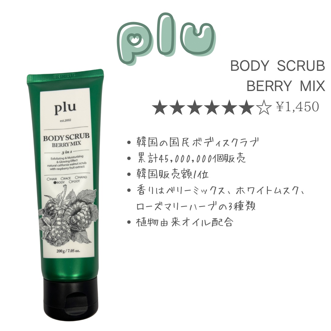 - plu ボディスクラブは韓国累積販売4600万個以上、クルミ穀粒配合のスクラブ。 甘酸っぱいベリーミックスの香り。