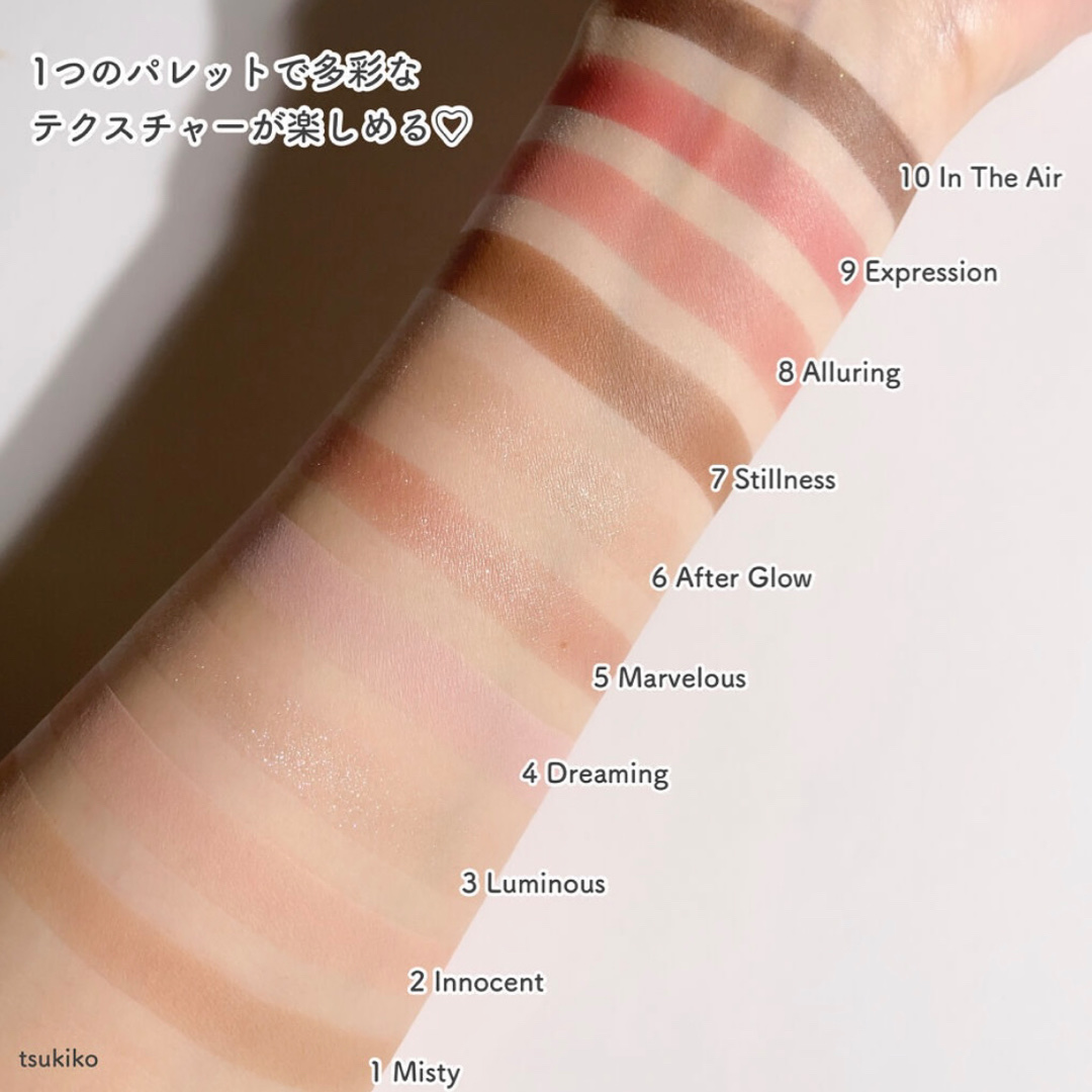 - <03 ライク・ア・シーン> タルク、オクテニルコハク酸デンプンAl、マイカ、酸化チタン、シリカ、トリ(カプリル/カプリン酸)グリセリル、トリエチルヘキサノイン、トリエトキシカプリリルシラン、ミリスチン酸Mg、メチルプロパンジオール、酸化鉄、ジメチコン、プロパンジオール、マカデミア種子油、ヘキサ(ヒドロキシステアリン酸/ステアリン酸/ロジン酸)ジペンタエリスリチル、水酸化Al、マンガンバイオレット、水 <04 ザ・ナラティブ> ジメチコン、イソドデカン、合成フルオロフロゴパイト、ホウケイ酸(Ca/Al)、ホウケイ酸(Ca/チタン)、メタクリル酸メチルクロスポリマー、酸化チタン、ジエチルヘキサン酸ネオペンチルグリコール、ラウリン酸ヘキシル、(ジメチコン/ビニルジメチコン)クロスポリマー、(セバシン酸/イソパルミチン酸)ジグリセリル、ナイロン-12、酸化鉄、セスキイソステアリン酸ソルビタン、ヘキサ(ヒドロキシステアリン酸/ステアリン酸/ロジン酸)ジペンタエリスリチル、ミリスチン酸Mg、マイカ、フェノキシエタノール、プロパンジオール、シリカ、合成ワックス <05 ニュー・ビギニング> タルク、マイカ、ポリプロピレン、トリエチルヘキサノイン、酸化鉄、ステアリン酸亜鉛、オクテニルコハク酸デンプンAl、酸化チタン、テトラエチルヘキサン酸ペンタエリスリチル、ジメチコン、トリエトキシカプリリルシラン、PCAジメチコン、エチルヘキシルグリセリン、水、カプリリルグリコール、赤226、水酸化Al、メチコン、トコフェロール <06 チャンス・オン> 酸化鉄、タルク、マイカ、リンゴ酸ジイソステアリル、酸化チタン、ホウケイ酸(Ca/Al)、ジメチコン、オクテニルコハク酸デンプンAl、窒化ホウ素、ステアロイルオキシステアリン酸オクチルドデシル、ナイロン-12、イソステアリン酸、水、エチルヘキシルグリセリン、カプリリルグリコール、トリエトキシカプリリルシラン、酸化スズ、トコフェロール <09 イン・モーション> 合成フルオロフロゴパイト、トリエチルヘキサノイン、酸化チタン、ジメチコン、(ジメチコン/ビニルジメチコン)クロスポリマー、ホウケイ酸(Ca/Al)、シリカ、スクワラン、ミリスチン酸Mg、リンゴ酸ジイソステアリル、カプリリルグリコール、赤226、カプリル酸グリセリル、エチルヘキシルグリセリン、酸化スズ、グンジョウ、水酸化Al、トリエトキシカプリリルシラン、水、塩化Na、硫酸Na、トコフェロール <10 イン・フロー> ジフェニルシロキシフェニルトリメチコン、ホウケイ酸(Ca/Al)、ホウケイ酸(Ca/チタン)、ポリプロピレン、ダイマージリノール酸(フィトステリル/イソステアリル/セチル/ステアリル/ベヘニル)、ダイマージリノール酸ダイマージリノレイルビス(ベヘニル/イソステアリル/フィトステリル)、ビスジグリセリルポリアシルアジペート-2、酸化チタン、ホウケイ酸(Ca/Na)、ヘキサ(ヒドロキシステアリン酸/ステアリン酸/ロジン酸)ジペンタエリスリチル、カプリリルグリコール、酸化スズ、カプリル酸グリセリル、エチルヘキシルグリセリン、マイカ、酸化鉄、合成フルオロフロゴパイト、赤226、硫酸Ba、シリカ、トコフェロール