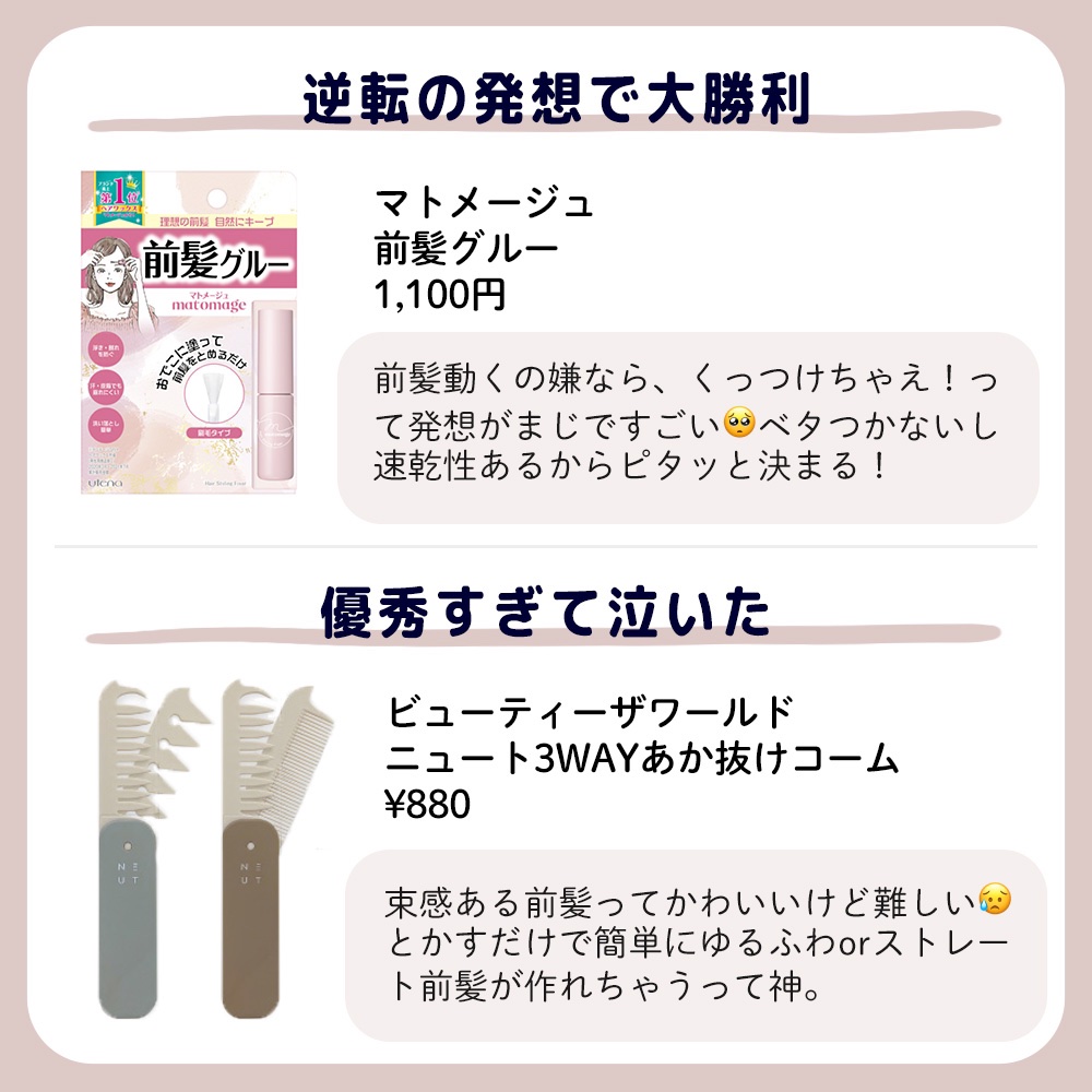 | ヘアスタイリングランキング第102位 | 前髪に特化!髪が形状記憶しているかのような崩れにくさ!特につけすぎ防止機能は嬉しい❤️ | 詳細を見る |