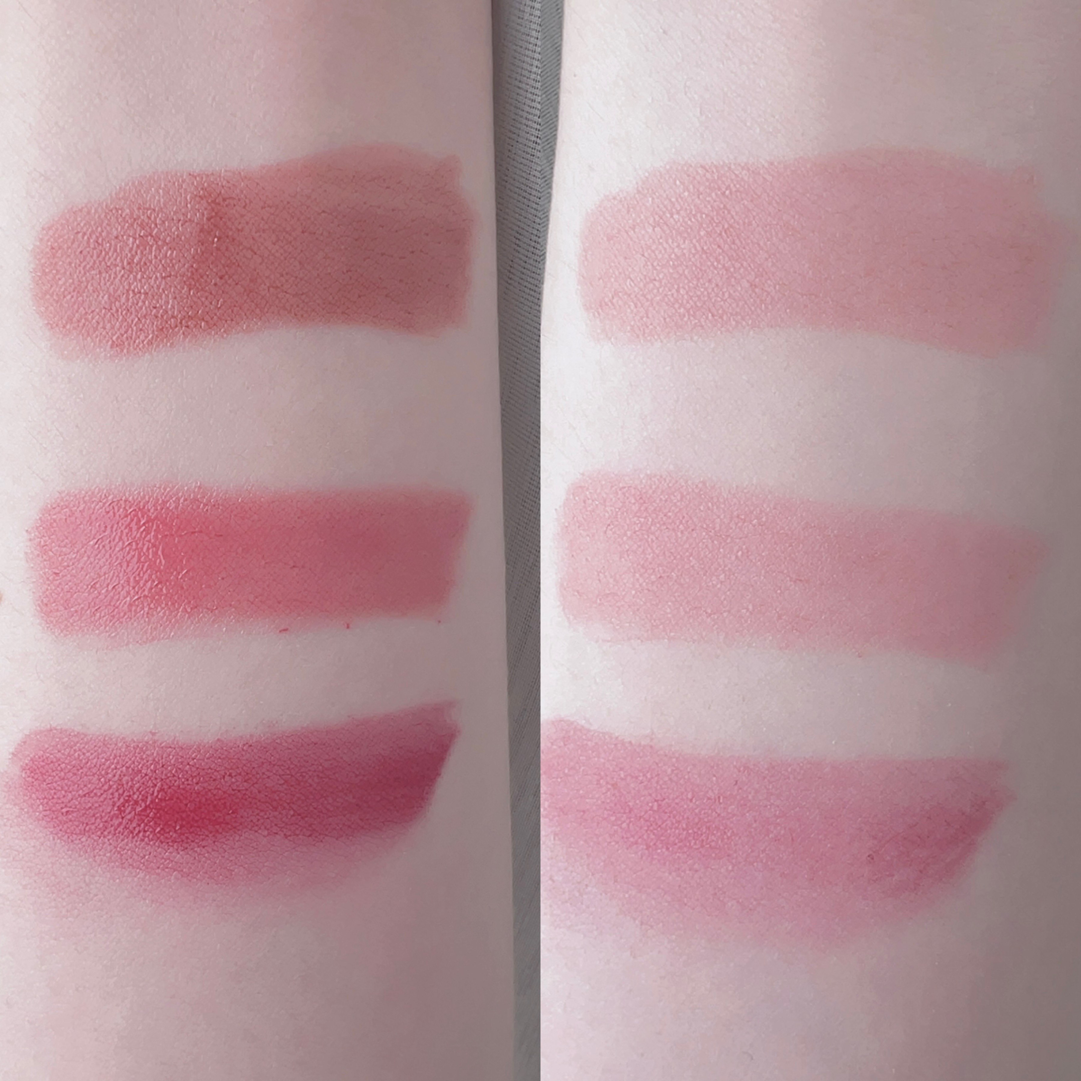 1つ880円で手に取りやすい価格とサイズ、たくさん集めたいコスメオタクとしてはとても嬉しいです🥰 サイズ感は通常サイズよりふた周りくらい小さくてポーチに入れても邪魔になりません リップモンスターなので当たり前の落ちなさ…!! ラメ感もしっかり残るのでいいですね〜✨ ブラウンリップを使ってみたいけど…と思ってるブルベさんに是非挑戦してみてほしい色です。 ブラウンで透け感がありベタっとつかないのでブラウンリップ初心者さんにも。 青ラメがザクザクで比較的ブルベでも使えるブラウンリップかなと思いました フラッシュピンクがどんな色かが分からない🤣 The・青みピンクでは無く少し黄みも感じられる色で私はベビーピンクのように思いました ピンクが好きなら好きな色かなーと。 1番ラメ感が控えめかなと。 1番ラメ感が強くて青ラメザクザク😍✨ 青ラメ好きさんこっちですよーと言いたくなる色です! 発色は1番淡いのでなにかの上に重ね塗りするのがいいかな〜 濃いめのリップが好きなのでこれだけならちょっと物足りなかったです😂