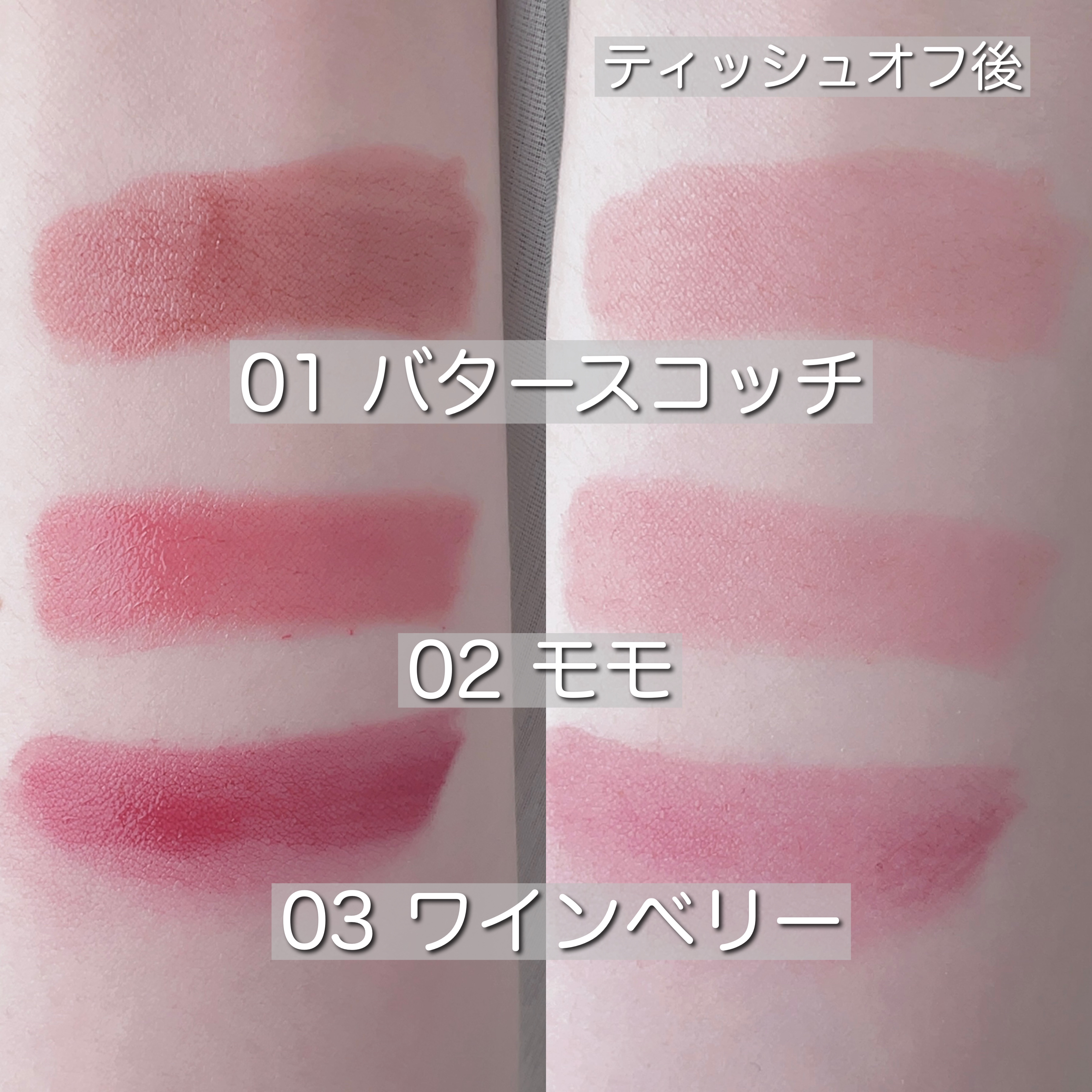 バームの使用感なのにスティック状で手軽なのが最大の魅力✨ 滑らかでまるでグロスみたいな艶感が特徴 保湿リップみたいに手軽に使えて一つ持っておくと便利! ただステイ力はないので色持ち重視なら下にティントとかを仕込んであげると良い🙆♀️ ただ柔らかいからこそ潰れやすくてリップの口周り?は汚れやすい💦 香りはフルーツキャンディみたいな甘めの香り🍬