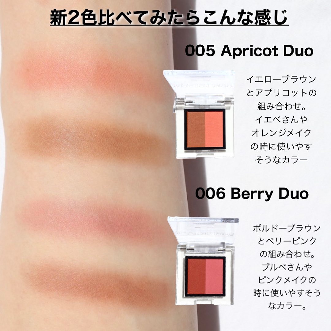 - <01 Cinnamon Duo シナモンデュオ> マイカ、タルク、ジメチコン、合成金雲母、リンゴ酸ジイソステアリル、ワセリン、窒化ホウ素、ミリスチン酸Mg、ジフェニルシロキシフェニルトリメチコン、パルミチン酸エチルヘキシル、フェニルトリメチコン、イソノナン酸イソトリデシル、ヒドロキシステアリン酸エチルヘキシル、ステアロイルグルタミン酸AL、ダイマージリノール酸(フィトステリル/イソステアリル/セチル/ステアリル/ベヘニル)、(ジメチコン/ビニルジメチコン)クロスポリマー、(VP/VA)コポリマー、ミリスチン酸亜鉛、メチコン、シルク、イソステアリン酸ソルビタン、ラウロイルリシン、水添ポリイソブテン、ヒマワリ種子油、ダイズ油、ニンジン根エキス、エチルパラベン、メチルパラベン、デヒドロ酢酸Na、[+/-]アルミナ、グンジョウ、コンジョウ、シリカ、酸化チタン、酸化鉄、酸化スズ、ホウケイ酸(Ca/AL)、赤226 <02 MarronDuo マロンデュオ> マイカ、タルク、ジメチコン、合成金雲母、リンゴ酸ジイソステアリル、ワセリン、窒化ホウ素、ミリスチン酸Mg、ジフェニルシロキシフェニルトリメチコン、パルミチン酸エチルヘキシル、フェニルトリメチコン、イソノナン酸イソトリデシル、ヒドロキシステアリン酸エチルヘキシル、ステアロイルグルタミン酸AL、ダイマージリノール酸(フィトステリル/イソステアリル/セチル/ステアリル/ベヘニル)、(ジメチコン/ビニルジメチコン)クロスポリマー、(VP/VA)コポリマー、ミリスチン酸亜鉛、メチコン、シルク、イソステアリン酸ソルビタン、ラウロイルリシン、水添ポリイソブテン、ヒマワリ種子油、ダイズ油、ニンジン根エキス、エチルパラベン、メチルパラベン、デヒドロ酢酸Na、[+/-]アルミナ、グンジョウ、コンジョウ、シリカ、酸化チタン、酸化鉄、酸化スズ、ホウケイ酸(Ca/AL)、赤226 <03 Almond Duo> タルク、ミネラルオイル、水添ポリイソブテン、ナイロン-12、トリエトキシカプリリルシラン、センチフォリアバラ花エキス、トコフェロール、BG、ジメチコン、セスキステアリン酸ソルビタン、合成ワックス、水、水酸化Al、メチルパラベン、グンジョウ、マイカ、酸化チタン、酸化鉄 <04 Espresso Duo> タルク、ミネラルオイル、水添ポリイソブテン、ナイロン-12、トリエトキシカプリリルシラン、センチフォリアバラ花エキス、トコフェロール、BG、ジメチコン、セスキステアリン酸ソルビタン、合成ワックス、水、水酸化Al、メチルパラベン、グンジョウ、マイカ、酸化チタン、酸化鉄 <005 Apricot Duo> タルク、ミネラルオイル、水添ポリイソブテン、ナイロン-12、トリエトキシカプリリルシラン、センチフォリアバラ花エキス、トコフェロール、BG、ジメチコン、セスキステアリン酸ソルビタン、マルトデキストリン、合成ワックス、酸化スズ、水、水酸化Al、メチルパラベン、カルミン、グンジョウ、マイカ、酸化チタン、酸化亜鉛、酸化鉄 <006 Berry Duo> タルク、ミネラルオイル、水添ポリイソブテン、ナイロン-12、トリエトキシカプリリルシラン、センチフォリアバラ花エキス、トコフェロール、BG、ジメチコン、セスキステアリン酸ソルビタン、マルトデキストリン、合成ワックス、水、水酸化Al、メチルパラベン、カルミン、グンジョウ、マイカ、酸化チタン、酸化亜鉛、酸化鉄