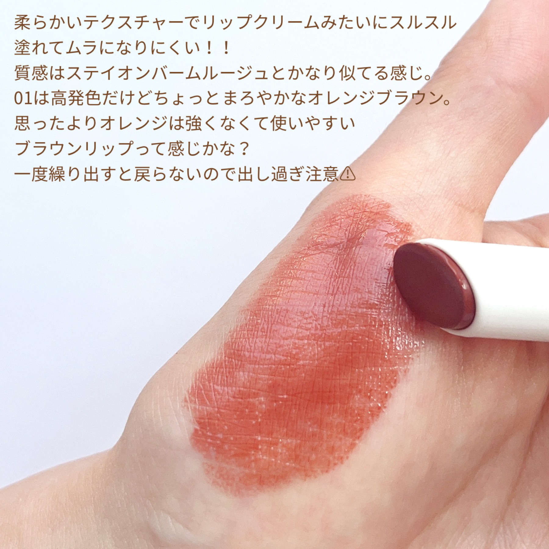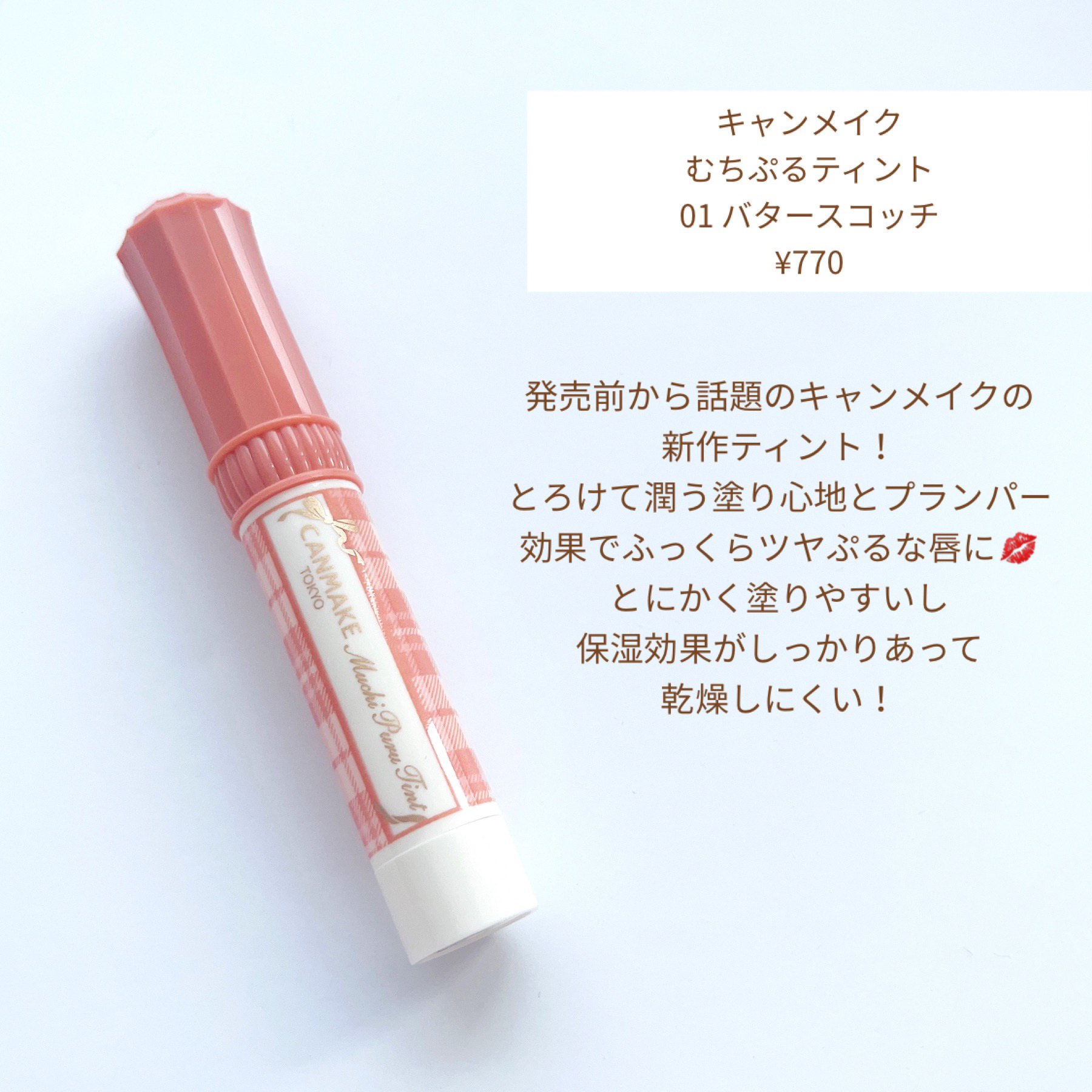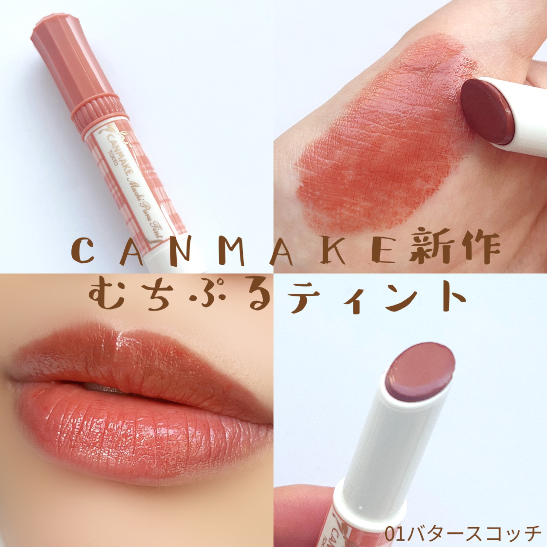 キャンメイク むちぷるティントキャンメイクのむちぷるティントをレビューします色は01バタースコッチです✦色味01番は黄み・深みのあるオレンジベージュしっかり色づく高発色リップですイエベの秋冬メイクにぴったりな色味だと思います✦色もちマスクやコ...