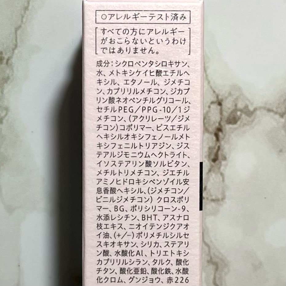 - <フレンチブルー> シクロペンタシロキサン、水、メトキシケイヒ酸エチルヘキシル、エタノール、ジメチコン、カプリリルメチコン、ジカプリン酸ネオペンチルグリコール、セチルPEG/PPG-10/1ジメチコン、(アクリレーツ/ジメチコン)コポリマー、ビスエチルヘキシルオキシフェノールメトキシフェニルトリアジン、ジステアルジモニウムヘクトライト、イソステアリン酸ソルビタン、メチルトリメチコン、ジエチルアミノヒドロキシベンゾイル安息香酸ヘキシル、(ジメチコン/ビニルジメチコン)クロスポリマー、BG、ポリシリコーン-9、水添レシチン、BHT、アスナロ枝エキス、ニオイテンジクアオイ油、(+/-)ポリメチルシルセスキオキサン、シリカ、ステアリン酸、水酸化Al、トリエトキシカプリリルシラン、タルク、酸化チタン、酸化亜鉛、酸化鉄、水酸化クロム、グンジョウ、赤226 <ベージュ> シクロペンタシロキサン、水、メトキシケイヒ酸エチルヘキシル、エタノール、ジメチコン、カプリリルメチコン、ジカプリン酸ネオペンチルグリコール、セチルPEG/PPG-10/1ジメチコン、(アクリレーツ/ジメチコン)コポリマー、ビスエチルヘキシルオキシフェノールメトキシフェニルトリアジン、ジステアルジモニウムヘクトライト、イソステアリン酸ソルビタン、メチルトリメチコン、ジエチルアミノヒドロキシベンゾイル安息香酸ヘキシル、(ジメチコン/ビニルジメチコン)クロスポリマー、BG、ポリシリコーン-9、水添レシチン、BHT、アスナロ枝エキス、ニオイテンジクアオイ油、(+/-)ポリメチルシルセスキオキサン、シリカ、ステアリン酸、水酸化Al、トリエトキシカプリリルシラン、タルク、酸化チタン、酸化亜鉛、酸化鉄、水酸化クロム、グンジョウ、赤226 <メロン> シクロペンタシロキサン、水、メトキシケイヒ酸エチルヘキシル、エタノール、ジメチコン、カプリリルメチコン、ジカプリン酸ネオペンチルグリコール、セチルPEG/PPG-10/1ジメチコン、(アクリレーツ/ジメチコン)コポリマー、ビスエチルヘキシルオキシフェノールメトキシフェニルトリアジン、ジステアルジモニウムヘクトライト、イソステアリン酸ソルビタン、メチルトリメチコン、ジエチルアミノヒドロキシベンゾイル安息香酸ヘキシル、(ジメチコン/ビニルジメチコン)クロスポリマー、BG、ポリシリコーン-9、水添レシチン、BHT、アスナロ枝エキス、ニオイテンジクアオイ油、(+/-)ポリメチルシルセスキオキサン、シリカ、ステアリン酸、水酸化Al、トリエトキシカプリリルシラン、タルク、酸化チタン、酸化亜鉛、酸化鉄、水酸化クロム、グンジョウ、赤226 <ラベンダー> シクロペンタシロキサン、水、メトキシケイヒ酸エチルヘキシル、エタノール、ジメチコン、カプリリルメチコン、ジカプリン酸ネオペンチルグリコール、セチルPEG/PPG-10/1ジメチコン、(アクリレーツ/ジメチコン)コポリマー、ビスエチルヘキシルオキシフェノールメトキシフェニルトリアジン、ジステアルジモニウムヘクトライト、イソステアリン酸ソルビタン、メチルトリメチコン、ジエチルアミノヒドロキシベンゾイル安息香酸ヘキシル、(ジメチコン/ビニルジメチコン)クロスポリマー、BG、ポリシリコーン-9、水添レシチン、BHT、アスナロ枝エキス、ニオイテンジクアオイ油、(+/-)ポリメチルシルセスキオキサン、シリカ、ステアリン酸、水酸化Al、トリエトキシカプリリルシラン、タルク、酸化チタン、酸化亜鉛、酸化鉄、水酸化クロム、グンジョウ、赤226 <レモン 香り付き> シクロペンタシロキサン、水、メトキシケイヒ酸エチルヘキシル、エタノール、ジメチコン、カプリリルメチコン、ジカプリン酸ネオペンチルグリコール、セチルPEG/PPG-10/1ジメチコン、(アクリレーツ/ジメチコン)コポリマー、ビスエチルヘキシルオキシフェノールメトキシフェニルトリアジン、キシリトール、ジステアルジモニウムヘクトライト、イソステアリン酸ソルビタン、メチルトリメチコン、ジエチルアミノヒドロキシベンゾイル安息香酸ヘキシル、(ジメチコン/ビニルジメチコン)クロスポリマー、乳酸メンチル、ポリシリコーン-9、水添レシチン、香料、メントール、メントキシプロパンジオール、BHT、(+/-)ポリメチルシルセスキオキサン、シリカ、ステアリン酸、水酸化Al、トリエトキシカプリリルシラン、タルク、酸化チタン、酸化亜鉛、酸化鉄、水酸化クロム <メロン 香り付き> シクロペンタシロキサン、水、メトキシケイヒ酸エチルヘキシル、エタノール、ジメチコン、カプリリルメチコン、ジカプリン酸ネオペンチルグリコール、セチルPEG/PPG-10/1ジメチコン、(アクリレーツ/ジメチコン)コポリマー、ビスエチルヘキシルオキシフェノールメトキシフェニルトリアジン、キシリトール、ジステアルジモニウムヘクトライト、イソステアリン酸ソルビタン、メチルトリメチコン、ジエチルアミノヒドロキシベンゾイル安息香酸ヘキシル、(ジメチコン/ビニルジメチコン)クロスポリマー、乳酸メンチル、ポリシリ