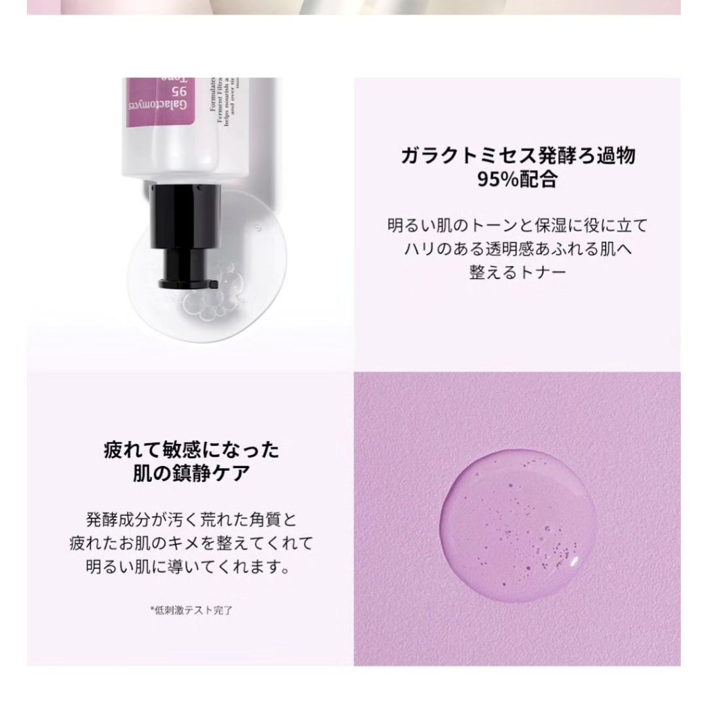- 1)ガラクトミセス発酵ろ過物* 95%含有 2)肌に潤いと弾力を与え透明感のある肌に導くトナー *保湿成分 <使用方法> エッセンス/アンプル段階で肌にまんべんなく伸ばし軽く叩いて馴染ませます。