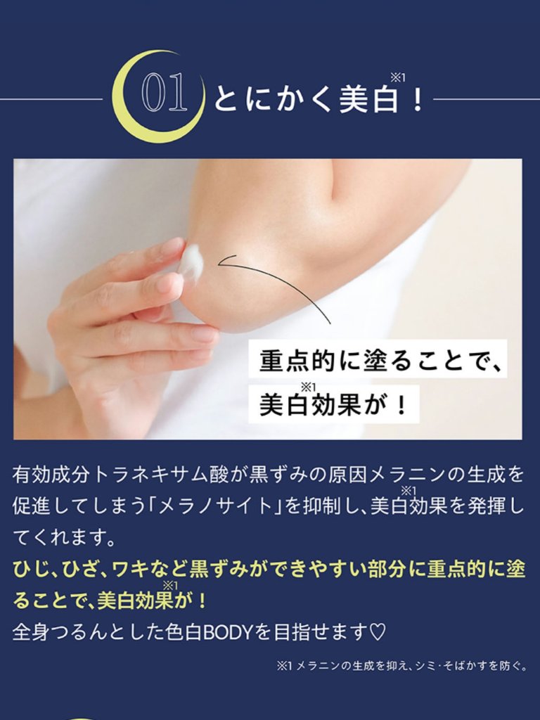 - 【医薬部外品】2種類の有効成分による美白(※1)+肌を整える効果のあるボディミルクです。わき・ひじ・ひざ・お尻などのデリケートゾーンはもちろん、全身にご使用いただけます。大人な「フルーティーワインの香り」で肌なじみがよく心地よい使用感となっています。 (※1)メラニンの生成を抑え、しみ、そばかすを防ぐ。