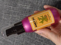 鮮やかなピンクのボトルがとってもキュート。 イラストに描かれているのはサボテン。 熱に強い天然植物オイル「ウチワサボテンオイル」が入っているから滑らかな髪に仕上がるそう。 ヘアエッセンスのテクスチャーは、とろーりとした少しねっとり感のあるオイル状。 ベリー系の甘くて可愛い香りがします。 ポンプで適量をとり、髪になじませて使用するだけ。 手のひらに出したときは、ねっとり重めのオイルですが、髪になじませるとベタベタせず、使いやすい! ドライヤー後の髪は落ち着いて見えます♪ 毎日ドライヤーのときに使用するし、髪が綺麗になるといいな。