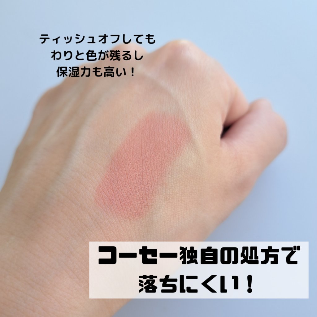 - ● 唇の内側の粘膜のような色・質感を再現した粘膜カラーが、唇の血色を自然に高めてむっちりとした色気のある印象的な唇へ導くスティックルージュです。 ● するすると軽い塗り心地でなめらかに唇へフィット。 みずみずしいツヤ感あふれる仕上がりです。 ● 塗布後、2層に分離するコーセー独自のラスティング処方を採用。 粘膜カラー層が唇にピタッと密着し、粘膜色フィルムコート成分が透明度の高いツヤの膜でコーティング。 美しい発色が8時間つづきます。 ※化粧もちデータ取得。(当社調べ。効果には個人差があります。) ● カップやマスクに触れても色移りしにくい、色持ちのよさ・落ちにくさを実現しました。 ● 粘膜カラーを再現した肌なじみのよいカラーラインアップ。 じんわりとした血色感と適度なツヤ感で、どんな方にもなじみやすいのが魅力です。 ● 無香料 ● 美容液成分〔ヒアルロン酸・スクワラン〕(保湿) ● 粘膜色フィルムコート成分(ツヤアップ & 色持ち成分) 粘膜色フィルムコート成分はトリメチルシロキシフェニルジメチコンです。