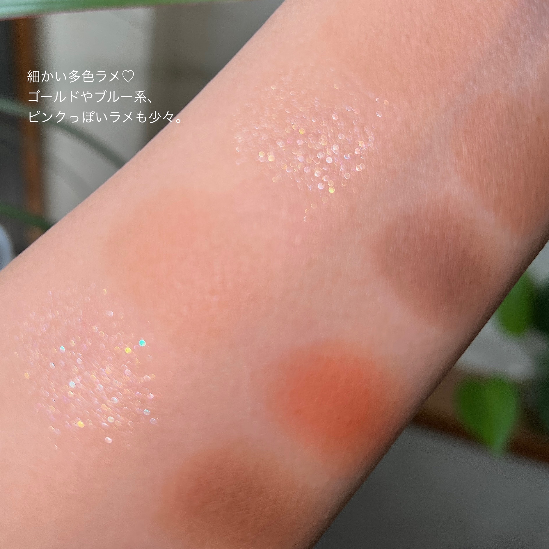 よくパレットのなかで明るいカラーをベースにまぶたに広く塗ることが多いのですが、パール感のあるカラーを避ける🙆♀️! パール感たっぷりの明るいカラーは涙袋に使うぐらい光を集めてぷっくり見せてくれるので、まぶたに広く使うと腫れぼったく見えがち😓 目元を明るくみせてくれたり、次に使うアイシャドウをぼかしやすくしてくれるけど、すっ飛ばしてメインのカラーを塗っちゃう✊🏻❤️🔥 涙袋にはたっぷり塗ってぷっくり見せる🙆♀️💕 シルキースフレアイズのマットタイプはすごく優れているな〜と感じました☺️💗 赤やオレンジなどは、入れすぎると腫れぼったく見えやすいので、見せたいカラーは下まぶた目尻にのせて色をたのしむ♡♡ パール感なしの透けマットだけじゃ物足りない… そう感じさせない華やかなラメが左上に入っているので黒目上と涙袋にのせるとすごく可愛い仕上がりに😍! 厄介な左右差のお陰でマットアイシャドウが好きになりました😌💕