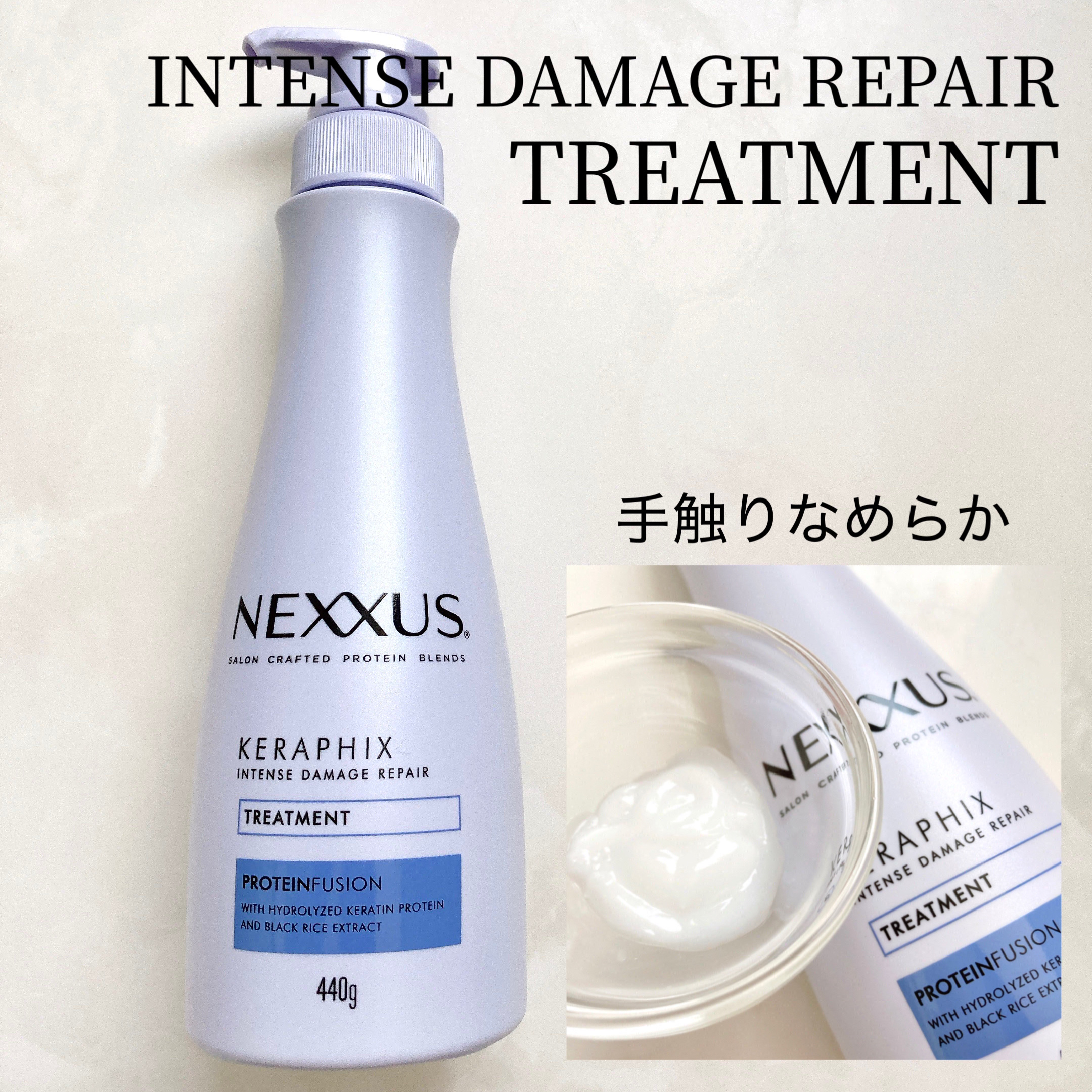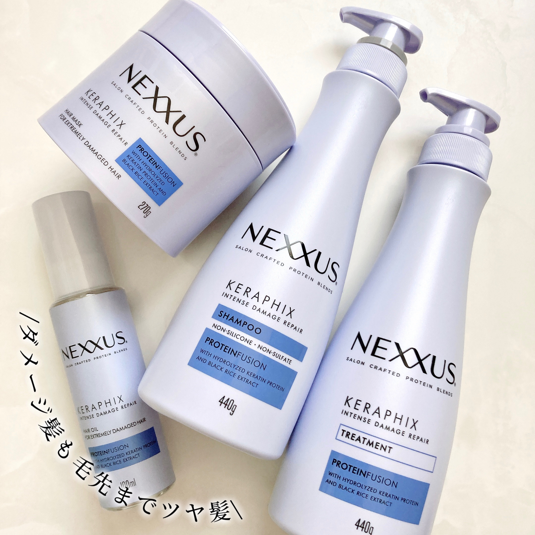 アメリカで累計62冠獲得した大人気のNEXXUS インテンスダメージリペアシリーズから新しい香りのピーチ&ジャスミンの香りが発売! 補修成分 髪悩みに応じたタンパク質が配合!ダメージリペアには加水分解ケラチンタンパク質が入っているよ ダメージリペアはダメージを抑える、補修するだけでなくヘアカラーの持続やパーマの持続も長くしてくれる