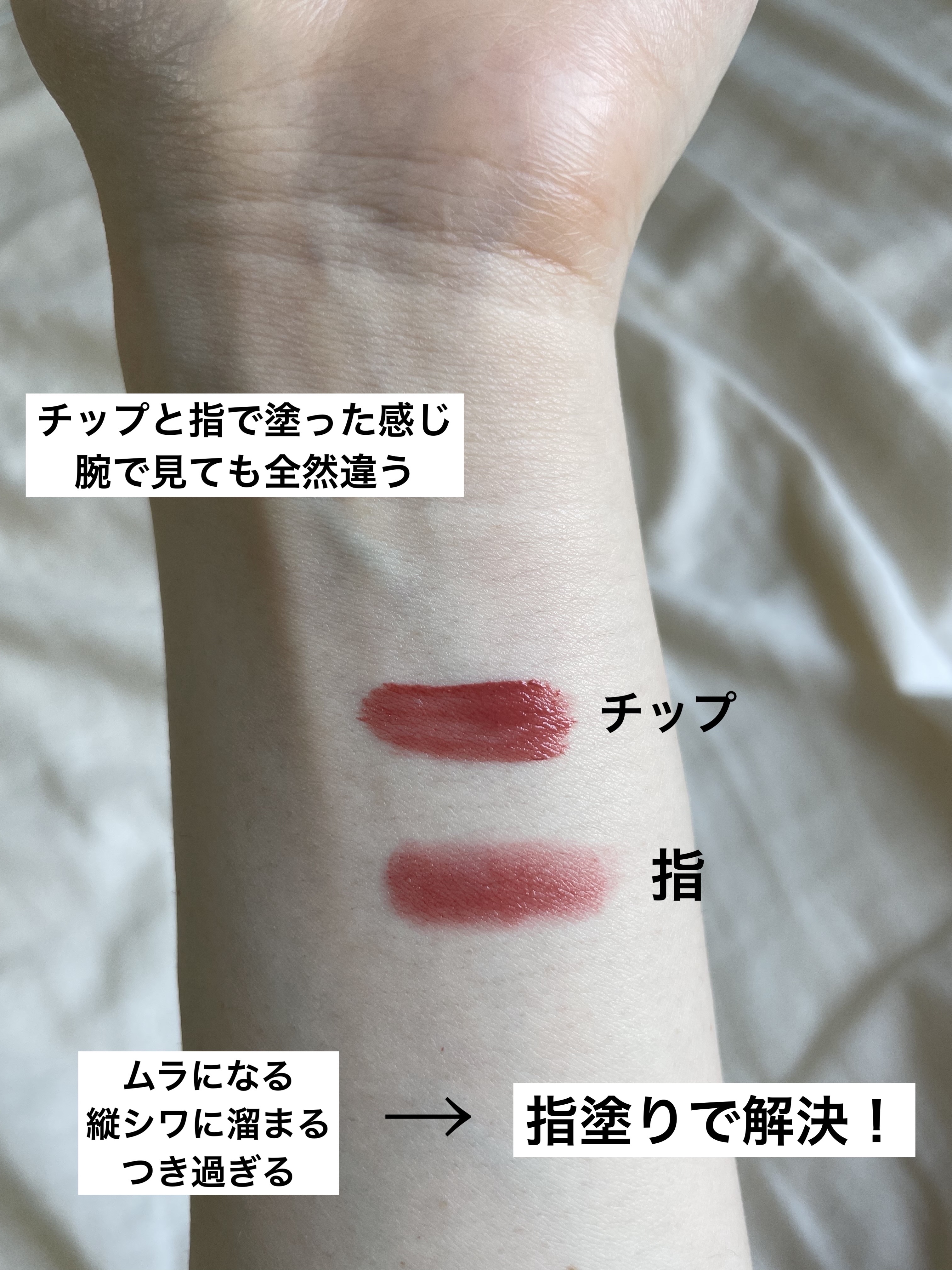 普通にチップで塗るとつき過ぎるし、ティッシュオフすると取れ過ぎる。 指で塗り広げるとふんわり色づく! ティッシュオフしなくても指でしっかり塗り込んでいればあんまり取れない! これはマカロンリップだ! 感動しました🥹 唇のコンディションが悪い時には皮に溜まる