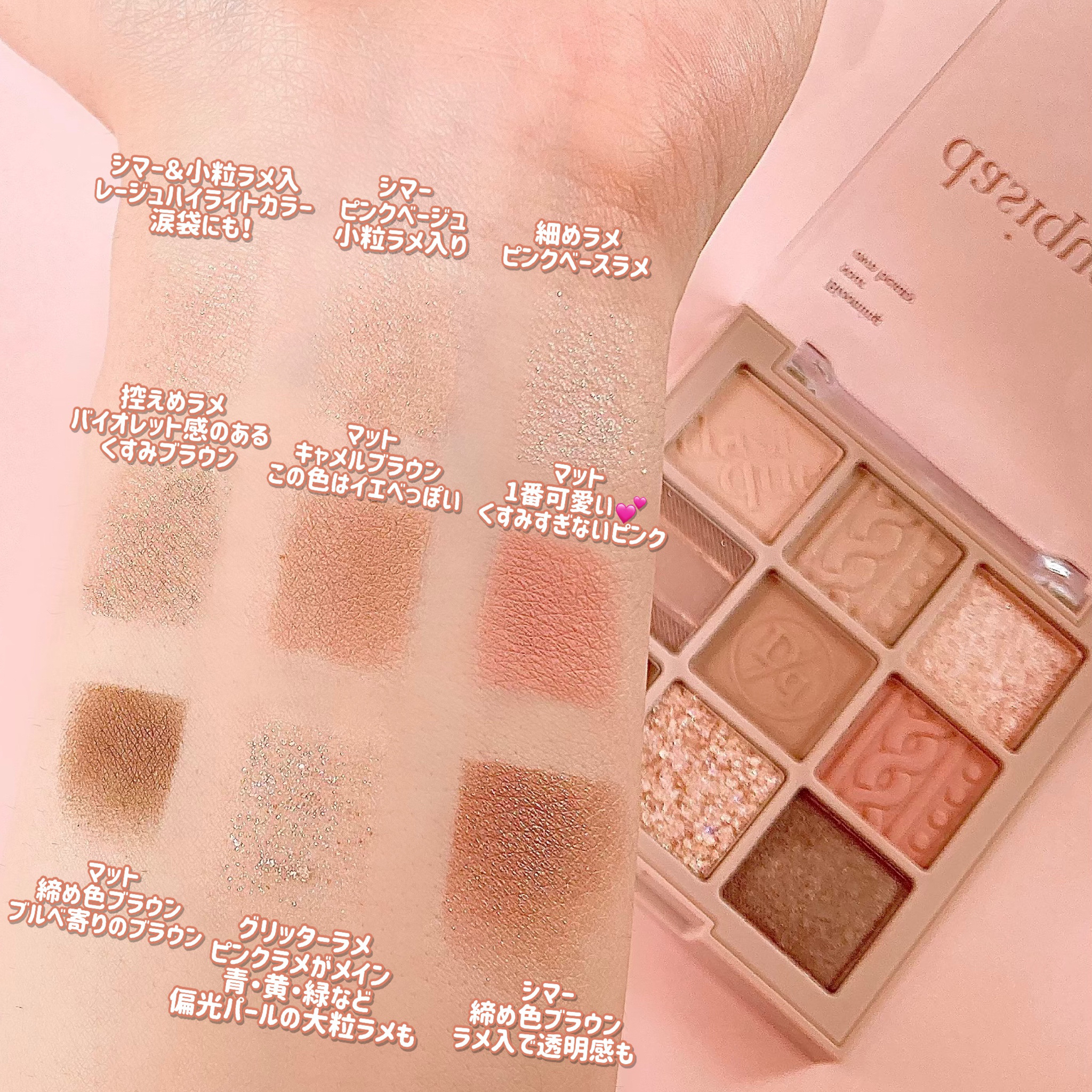 コーラルピンクやくすみ過ぎないレッドが入っているパレット! ラメがイエローラメですごく可愛い! コーラルピンクとレッドのアイシャドウはラメ入りとマットタイプがあって気分に合わせて色んなメイクが出来ます お気に入りポイントは右上のホワイトシルバーのようなカラーにパールがたくさん入っていて涙袋に塗るとぷっくり見えるところ! カラーは一見濃く見えますがテクスチャーが柔らかく、発色は控えめでふんわり発色です 春メイクやピンクメイクがお好きな方にオススメしたい話題のアイシャドウでした!