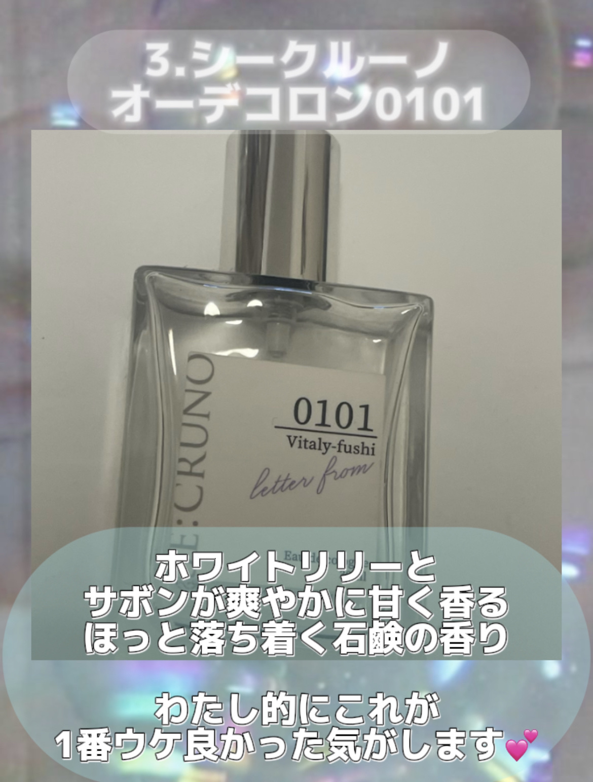 #PRSE:CRUNO@Secrunoofficial様よりロメリア469Glitteroilfragranceをいただきました。数量限定発売のホワイトウーロンの香り。清らかで気品溢れる純白のドレスを彷彿とさせる美しい香りです。グリッターも上...