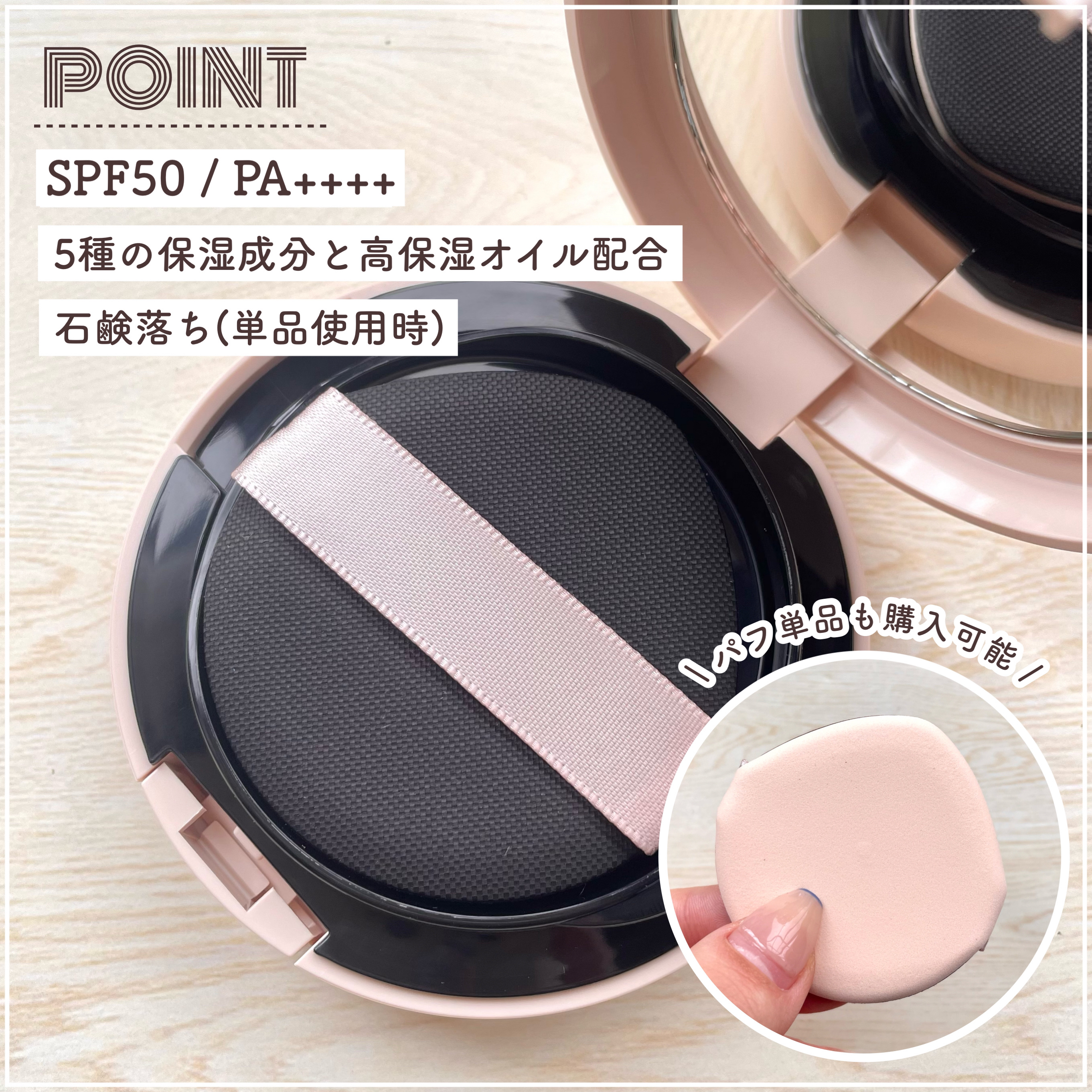 - <本体> 薄膜がぴたっと密着し艶肌続くクッションファンデ。 シミ・毛穴・色ムラをカバーしてお肌にぴたっと密着しメイク崩れしにくい。 5種の保湿成分(スクワラン、セラミドNP、ベルガモット果実エキス、ヒアルロン酸Na、アーチチョーク葉エキス)と高保湿オイルを配合。 重ねても厚塗りになりにくく、まるでお肌の内側から潤ったような艶肌仕上げ。 SPF50 PA++++。 石鹸で落とせます。(※単品使用の場合) <パフ> セザンヌのクッションファンデーションに使える替パフ2個入。 広い面や細部までも使いやすいしずく型パフで、ファンデーションをムラなくきれいに仕上げます。 クッション面にパフを押し当て、ファンデーションを適量とり、軽くたたくようにお肌に塗布してください。 ※汚れたときは、うすめた台所用中性洗剤で軽く押し洗いをし、よく洗い流してください。その後水気を切り、陰干ししてください。