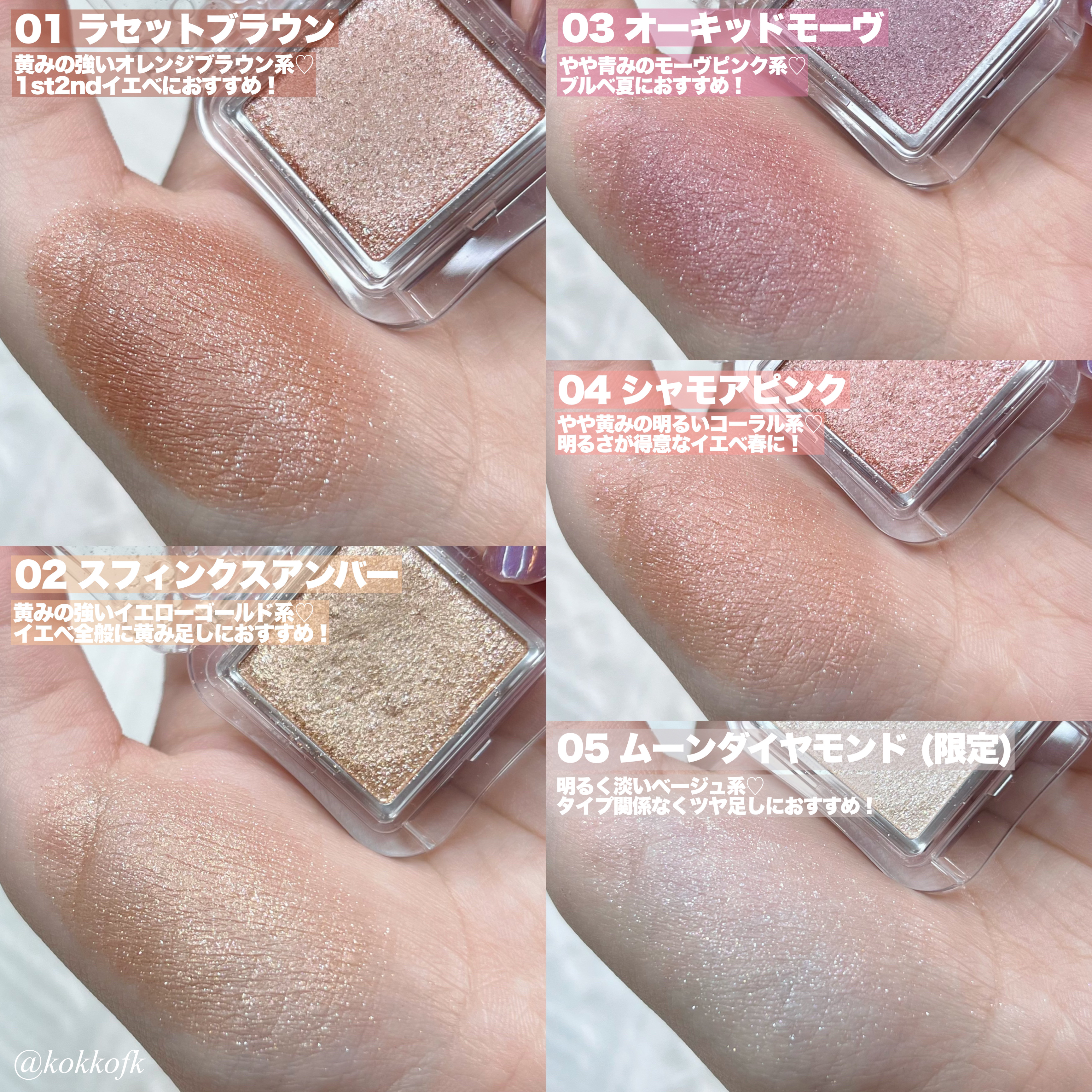 - <01 ラセットブラウン> タルク、ホホバ種子油、リンゴ酸ジイソステアリル、ジメチコン、ワセリン、(HDI/トリメチロールヘキシルラクトン)クロスポリマー、1,2-ヘキサンジオール、メタクリル酸メチルクロスポリマー、シリカ、イソステアリン酸ソルビタン、トコフェロール、スクワラン、セラミドNP、水、ヒアルロン酸Na、メチルパラベン、BG、フェノキシエタノール、水溶性コラーゲン、エチルパラベン、マイカ、酸化鉄、合成フルオロフロゴパイト、ホウケイ酸(Ca/Al)、酸化チタン、酸化スズ <02 スフィンクスアンバー> タルク、ホホバ種子油、リンゴ酸ジイソステアリル、ジメチコン、ワセリン、(HDI/トリメチロールヘキシルラクトン)クロスポリマー、シリカ、1,2-ヘキサンジオール、メタクリル酸メチルクロスポリマー、イソステアリン酸ソルビタン、トコフェロール、スクワラン、セラミドNP、水、ヒアルロン酸Na、メチルパラベン、BG、フェノキシエタノール、水溶性コラーゲン、エチルパラベン、マイカ、ホウケイ酸(Ca/Al)、酸化鉄、合成フルオロフロゴパイト、酸化チタン、酸化スズ <03 オーキッドモーヴ> タルク、ホホバ種子油、リンゴ酸ジイソステアリル、ジメチコン、ワセリン、(HDI/トリメチロールヘキシルラクトン)クロスポリマー、1,2-ヘキサンジオール、メタクリル酸メチルクロスポリマー、シリカ、イソステアリン酸ソルビタン、トコフェロール、スクワラン、セラミドNP、水、ヒアルロン酸Na、メチルパラベン、BG、フェノキシエタノール、水溶性コラーゲン、エチルパラベン、合成フルオロフロゴパイト、ホウケイ酸(Ca/Al)、酸化鉄、グンジョウ、マイカ、酸化チタン、アルミナ、水酸化Al、赤226、酸化スズ <04 シャモアピンク> タルク、ホホバ種子油、リンゴ酸ジイソステアリル、ジメチコン、ワセリン、(HDI/トリメチロールヘキシルラクトン)クロスポリマー、1,2-ヘキサンジオール、メタクリル酸メチルクロスポリマー、シリカ、イソステアリン酸ソルビタン、トコフェロール、スクワラン、セラミドNP、水、ヒアルロン酸Na、メチルパラベン、BG、フェノキシエタノール、水溶性コラーゲン、エチルパラベン、マイカ、合成フルオロフロゴパイト、ホウケイ酸(Ca/Al)、酸化鉄、酸化チタン、酸化スズ