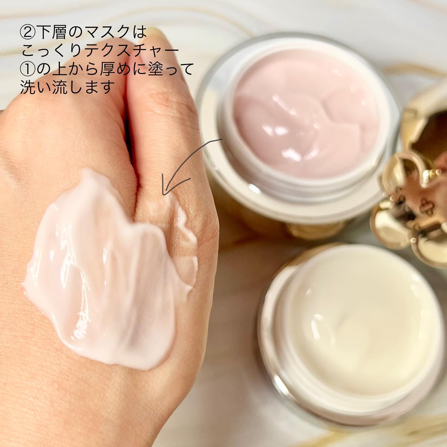 ゴージャスなゴールドとかわいいお花のパッケージがツボすぎる… 肌に直接乗せるクリームタイプのフェイスマスクのほうが繊細な凹凸もカバーできるとのこと どちらのクリームもほんのり桃色で化粧水でふきとったあとはふっくら、しっとり