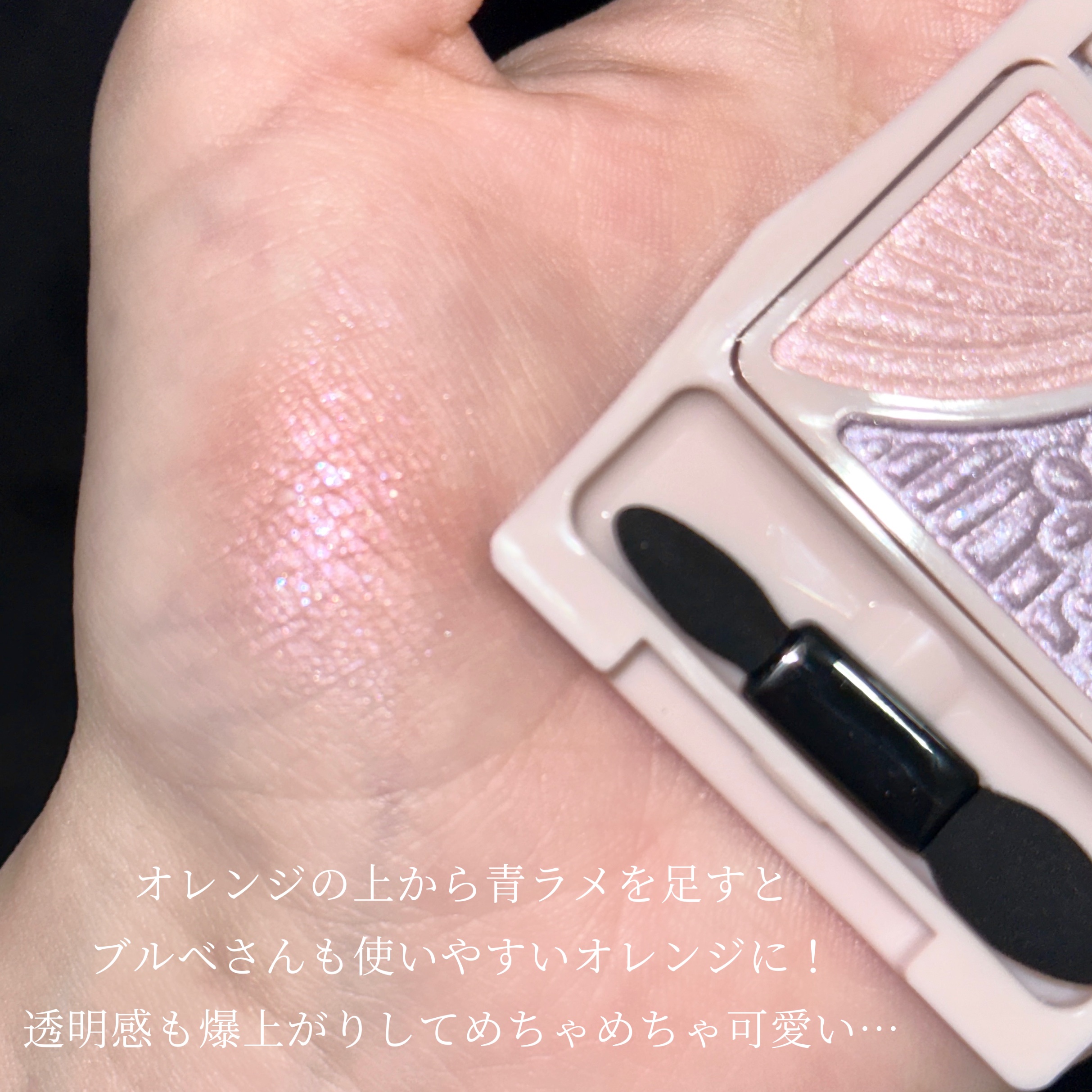 - パウダーなのにみずみずしい♥ 自然な立体感をつくりだす3色アイシャドウパレット 仕上げのコートで、ジューシー感&モチUP! メインカラー&ラインカラーはフィッティングオイル配合のしっとりパウダーで、 まぶたに吸いつくように溶け込み、ジューシーコートスフレで覆うことによって、 濡れたようにツヤめく愛されまぶたで透明感のある目元を演出します。