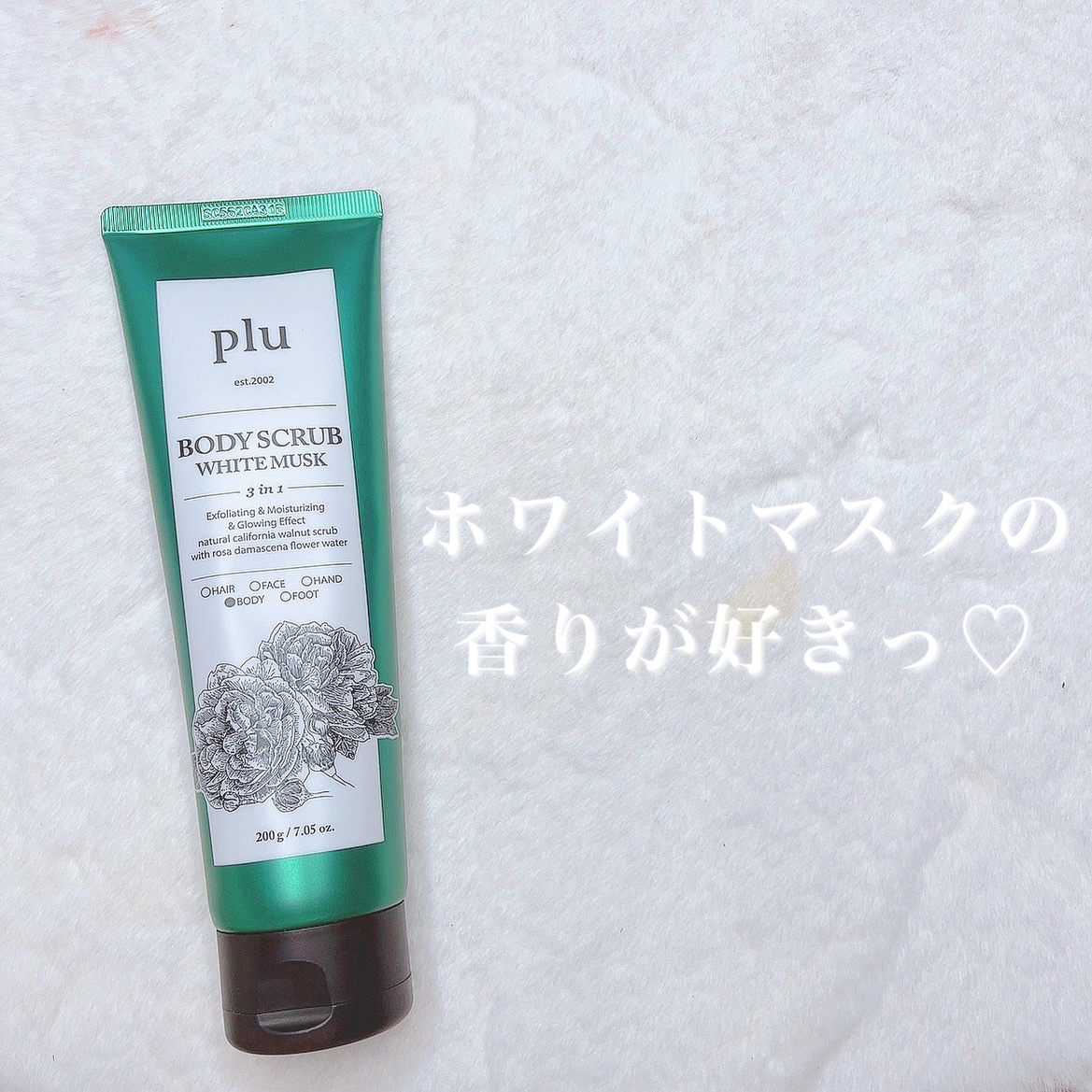 - plu ボディスクラブは韓国累積販売4600万個以上、クルミ穀粒配合のスクラブ。 ふんわりと暖かみのあるホワイトムスクの香り。