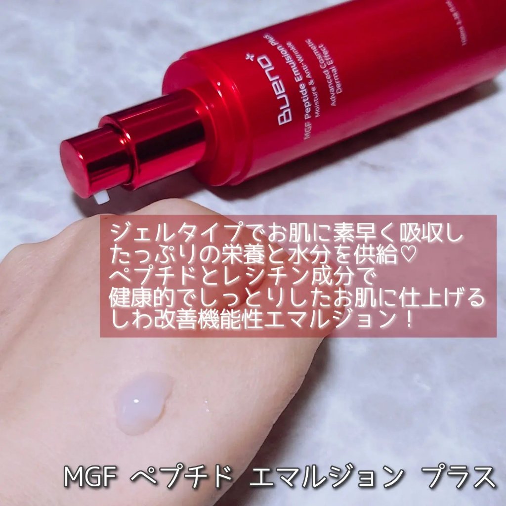 Bueno(ブエノ)は美容皮膚科で施術をしなくても簡単にお家でお肌を健康に美しくケアすることができるホームメディケア皮膚再生専門ブランド。 MGF ペプチド トナー プラス✎ღ ✅ MGF※と5種類のペプチド成分 ✅トマトカルス培養エキスがお肌にしっかりと水分を浸透 ✅お肌の弾力を強化するアデノシン ✅お肌をよりしなやかに弾力を与えるパンテノール・レシチン 独自開発し特許を取得した成分MGF※と共に、天然由来成分を配合した機能性トナー。 精製水の代わりにガラクトミセス発酵濾過水が使われています。 サラっとしたテクスチャーですが、肌馴染みが良くてしっとりとするような使い心地です☺️ 時折カサつく肌もしっとりツヤ感でとても気に入ってます♡