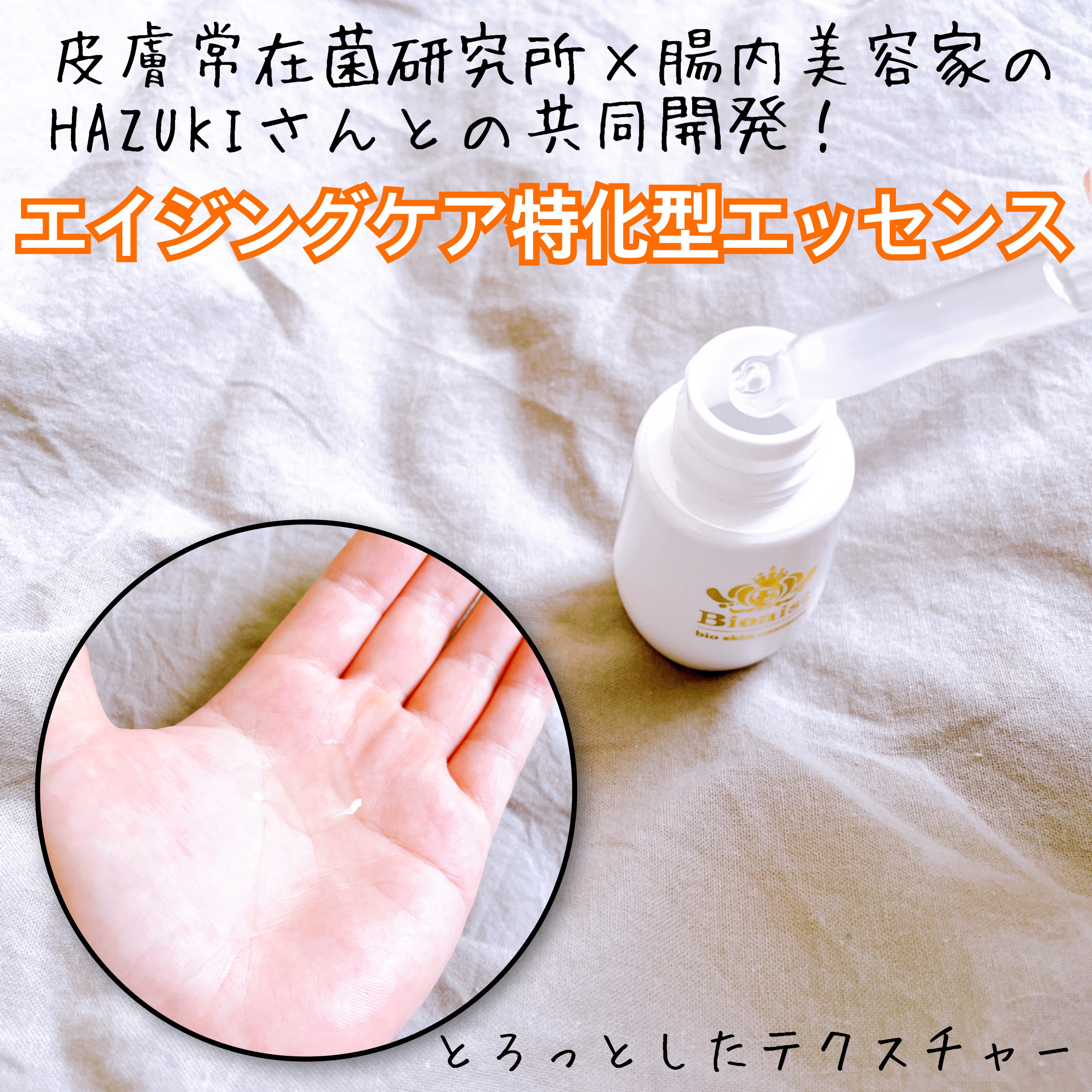 - 1.皮膚常在菌研究所×腸内美容家『HAZUKI』の共同開発 菌の専門家と美のエキスパートがコラボレーションしてエイジングケアに特化したエッセンスを開発しました。 2.「美肌菌×ヒト幹細胞」でWスペシャルエイジングケア ヒト幹細胞配合により、しわの予防と改善、美白効果、たるみの改善、抗酸化作用などエイジングケアに効果が期待できます。さらに乳酸菌生産物質配合による美肌菌ケアで自活肌へと導きます。 3.乳酸菌生産物質を高濃度配合 従来の商品(※BIONIST bio skin lotion)に比べて主成分である乳酸菌生産物質を約2倍配合!美肌菌へのアプローチ力を高めて素早く効果を実感し、エイジングケアに特化しました。 4.つけた3秒後に「さらっ!」 独自の技術により高浸透を実現し、しっかりした潤いを実感をしながらさらっとした仕上がりを体感できます。