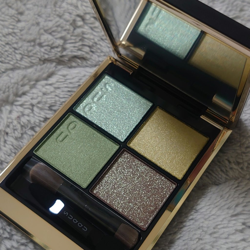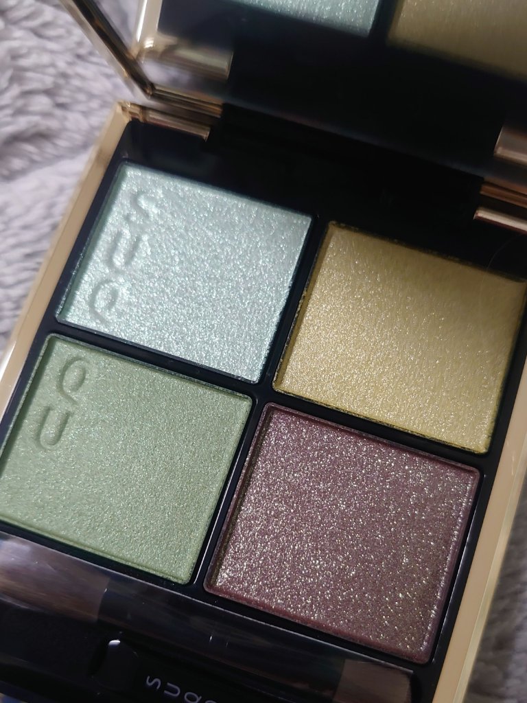 美しくてどうしても欲しくて買ったのが2023年の初夏、観賞用にと開けられないままだったけどやっぱり使わなきゃ勿体ない! 絶妙なグリーンが上品に肌に馴染む!海外のド派手なグリーンアイシャドウとは一線を画す、日本ブランドにしか、いやSUQQUにしか作れない、上品なグリーン…! 右下のブラウンもただの焦茶じゃないの、見る角度によって色が変わる偏光ラメブラウン。SUQQUならではの上品なチラチララメが眩い…