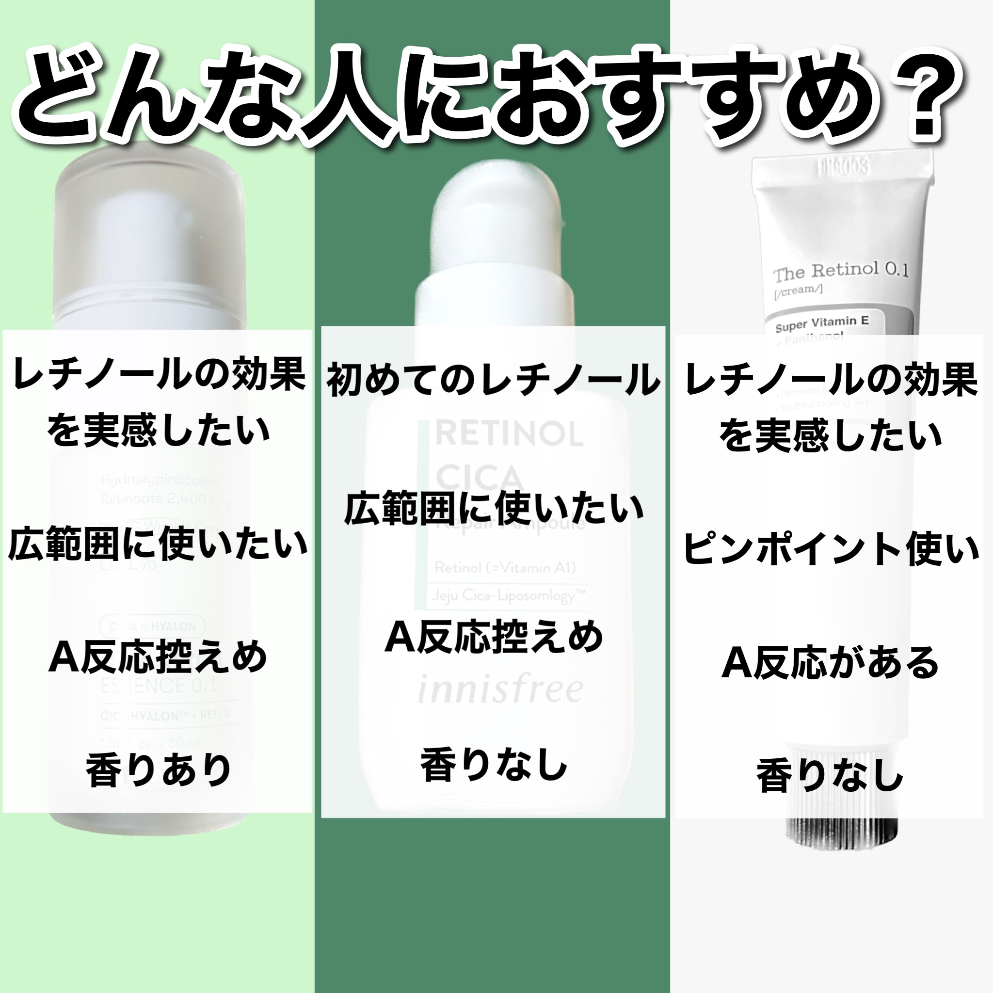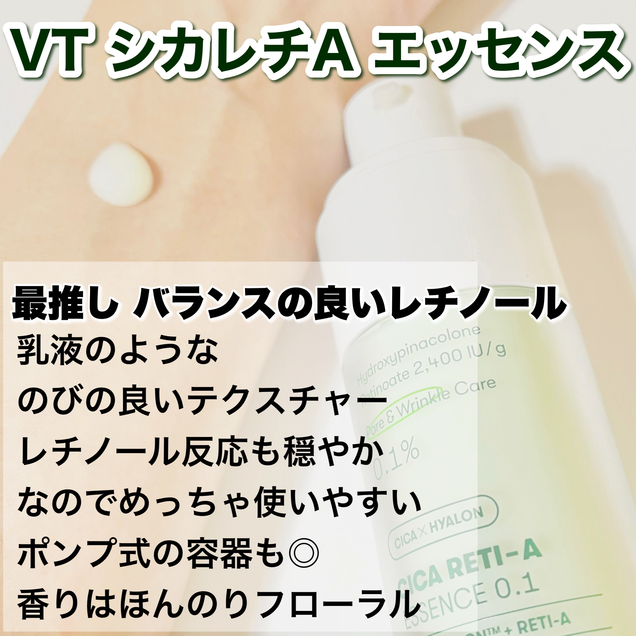 もうレチノールで悩まない!大人気レチノール比較【VT】シカレチAエッセンス0.1容量:30ml価格:3300円1mlあたり:110円【innisfree】レチノール シカ リペア セラム容量:30ml価格:3960円1mlあたり:132円【C...