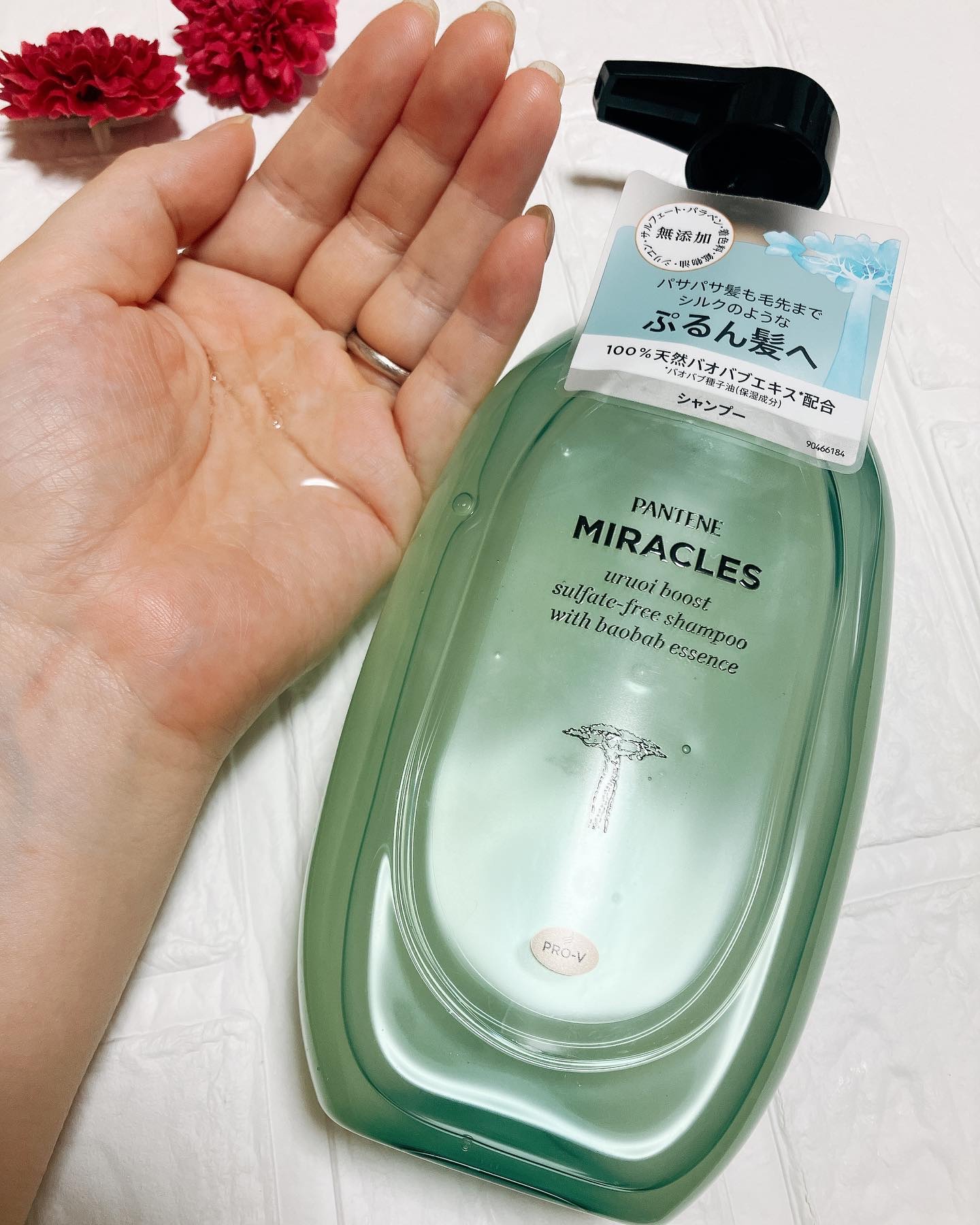 ボトルのフォルムがマカロンみたいでかわいくて気になってた「パンテーン ミラクルズ うるおいブースト」🍑✨ 使ってみたら、香りがめちゃくちゃ良くて家族にも褒められた🥰 クリーンムスクの香りがふんわり続くのが嬉しい💕 シャンプーは泡立ちがよく、泡がしっとりしてる感じ◎ ドライ後の髪もまとまりが良くて、これからも使い続けたい!