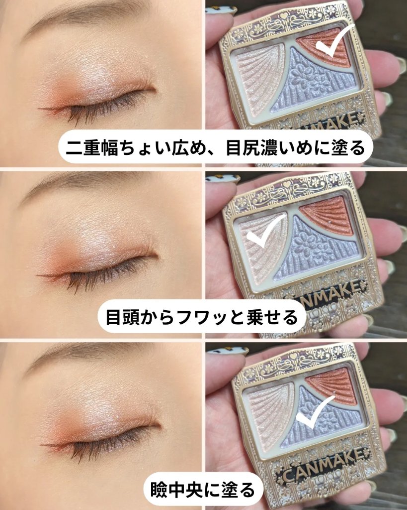 - パウダーなのにみずみずしい♥ 自然な立体感をつくりだす3色アイシャドウパレット 仕上げのコートで、ジューシー感&モチUP! メインカラー&ラインカラーはフィッティングオイル配合のしっとりパウダーで、 まぶたに吸いつくように溶け込み、ジューシーコートスフレで覆うことによって、 濡れたようにツヤめく愛されまぶたで透明感のある目元を演出します。