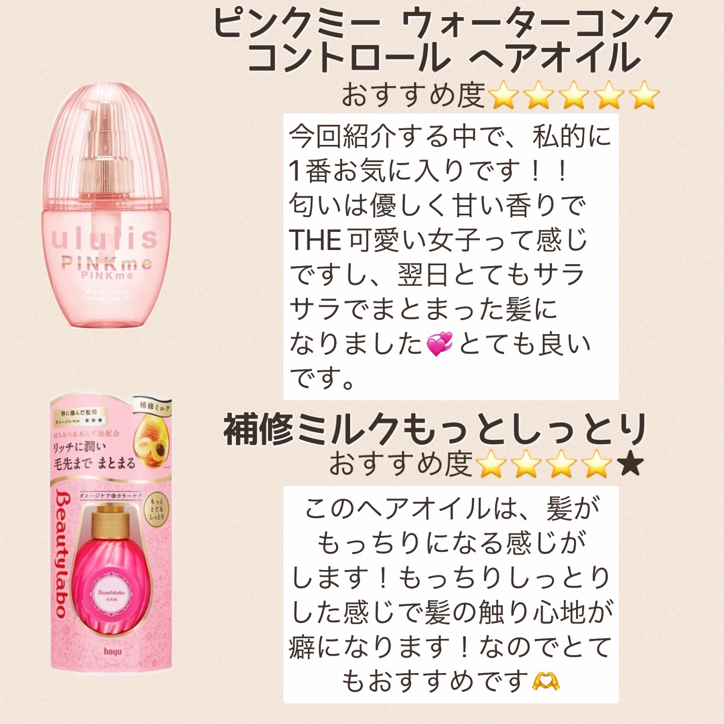 1位エルジューダグレイスオン エマルジョン 2位ululisピンクミー ウォーターコンク コントロール ヘアオイル 3位オルビスエッセンスインヘアミルク 4位YOLUカームナイトリペアヘアオイル 5位ルシードエルオイルトリートメント #EXヘアオイル 6位&honeyディープモイスト ヘアオイル3.0 7位柳屋あんず油柳屋あんず油 8位ビューティラボ補修ミルク もっととてもしっとり