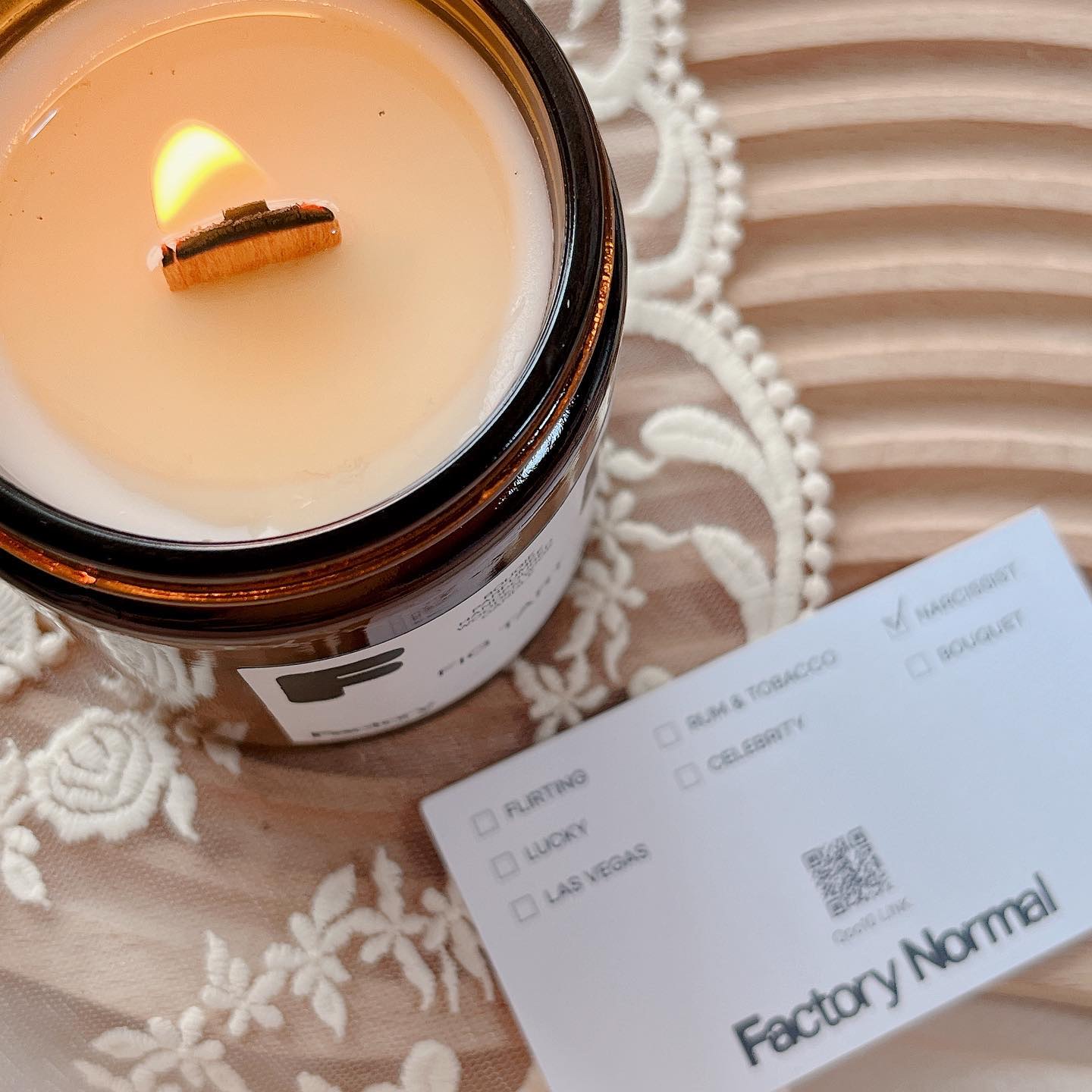 香りはムエットで気になっていた人気No.1のナグチャンパ。 これは…お寺だ…落ち着く白檀の香り。 焚き火のようにパチパチ音を立てながら芯が燃えるキャンドルで、香りも音も見た目もすべてが癒し。 ファクトリーノーマルはパッケージがおしゃれなので、プレゼントとしてもおすすめです🎁‧⁺ ⊹˚.