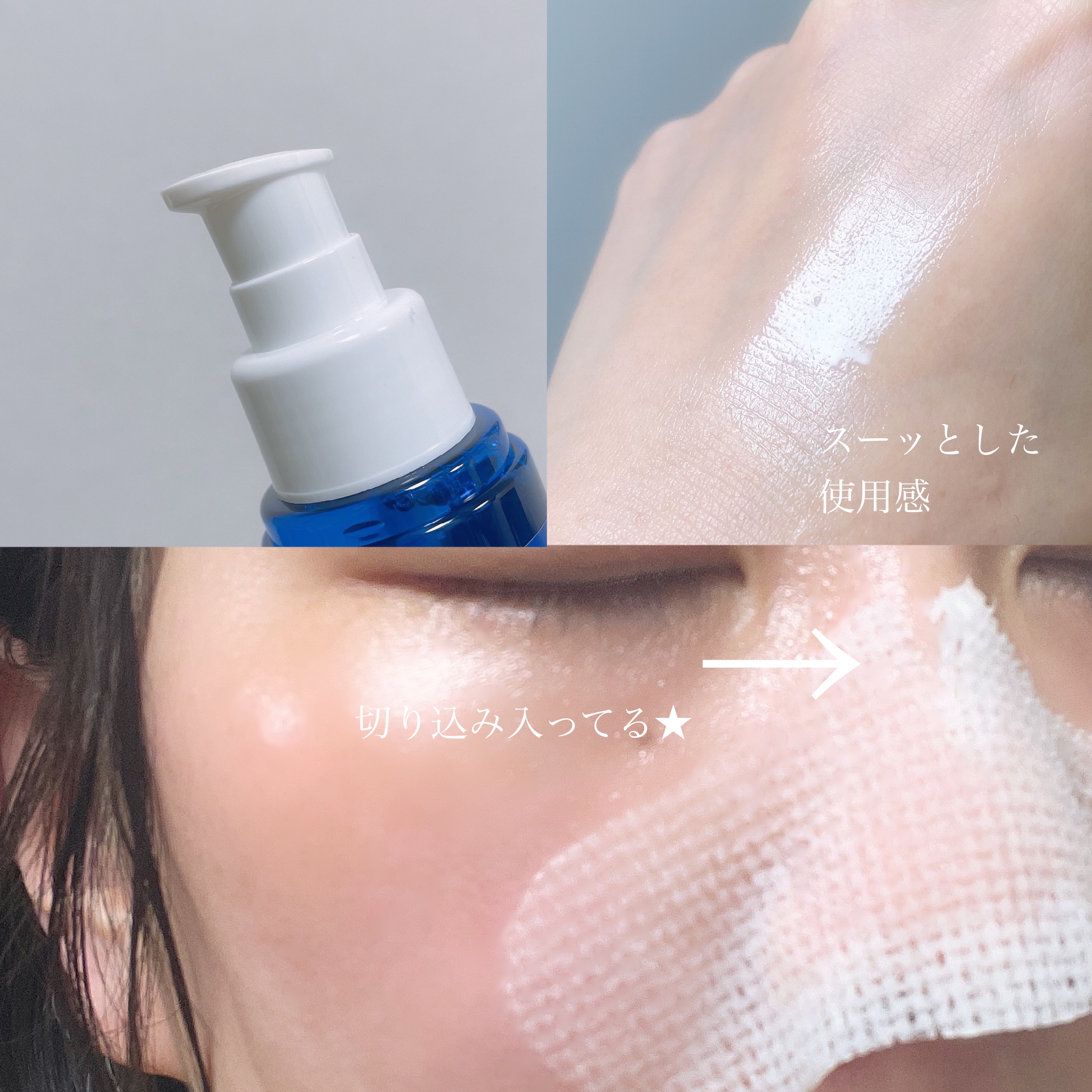 バブル🫧 ͛.* 青っぽいカラーのエッセンスと思いきや、 塗り広げていくと、なんと泡に変化していくエッセンス。 4~5プッシュを顔に塗り広げて、 バブルが生成されたら馴染ませていく。しかもエアレス容器なのも嬉しい★ バブルタイプのトナーが面白い! 柔らかく、きめ細かい泡が肌に乗せるとシュワっと気持ちいいです🤍 肌に乗せても手からポタポタ垂れないからそこも嬉しい★ 仕上がりはしっとりめで、肌に密着するような感覚┈♡゙ 香りは2つともにフローラル系で とてもいい香りです⿻*. ハリに効果が期待できるそう! W使いで顔だけでなく、首やデコルテまで 楽しくスキンケアできちゃいます❤︎