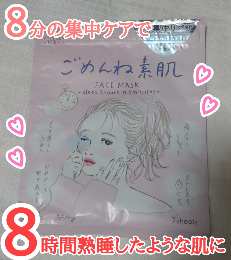 - 【クリアターン ごめんね素肌マスク】 負担をかけて、あれてしまった肌の素肌環境※1をととのえる“速攻集中リペア※2マスク”です。 ① あれがちな肌を素早くコンディションケア! ザクロエキス、桜エキス※3、ウメ果実エキスBG配合し、ゆらぎやすい肌環境をととのえ、肌あれをケアします。また、うるおいケア成分として、ヒアルロン酸、白キクラゲ多糖体BGを配合。外的ストレス※4や不規則な生活の影響を受けやすい肌も健やかでゆらぎにくい肌へみちびきます。 ②敏感肌も使える、弱酸性・低刺激処方 無香料・無着色・無鉱物油・アルコールフリー(エチルアルコール)・パラベンフリー・紫外線吸収剤フリー・シリコーンフリー・パッチテスト済み・アレルギーテスト済み・スティンギングテスト済み・敏感肌自覚者による連用テスト済み(すべての方にアレルギーや皮膚刺激が起きない、刺激感がないというわけではありません。すべての方の肌に合うということではありません。) ③角質ケアもできる!凸凹高密着シート コットン生まれのやわらかな肌触りのベンリーゼを使用。 表面に凸凹のエンボス加工を施しているため、密着性が高く、はがしたマスクでやさしく顔をふきとることで角質ケアもできます。 ※1 うるおい環境のこと ※2 うるおいお手入れのこと ※3 ソメイヨシノ葉エキス、ウメ果実エキスBGはウメ果実エキス・BG(保湿) ※4 乾燥による刺激のこと