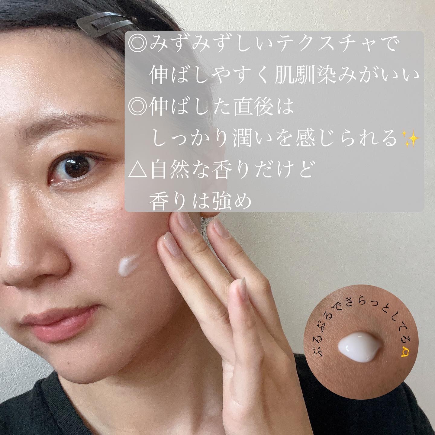 ポンプ式だから出しやすい❢ 肌にスーッと馴染んでいき、 香りはゼラニウムの様な癒される香りです。 塗るとしっとりした使い心地なのに ベタつかないから、 乾燥が気になる部分には 重ね塗りも出来るのが良いですね✨ 夜のスキンケアに使うと もちっとした触り心地が 翌日まで続くのがすごかったです🕊🌿