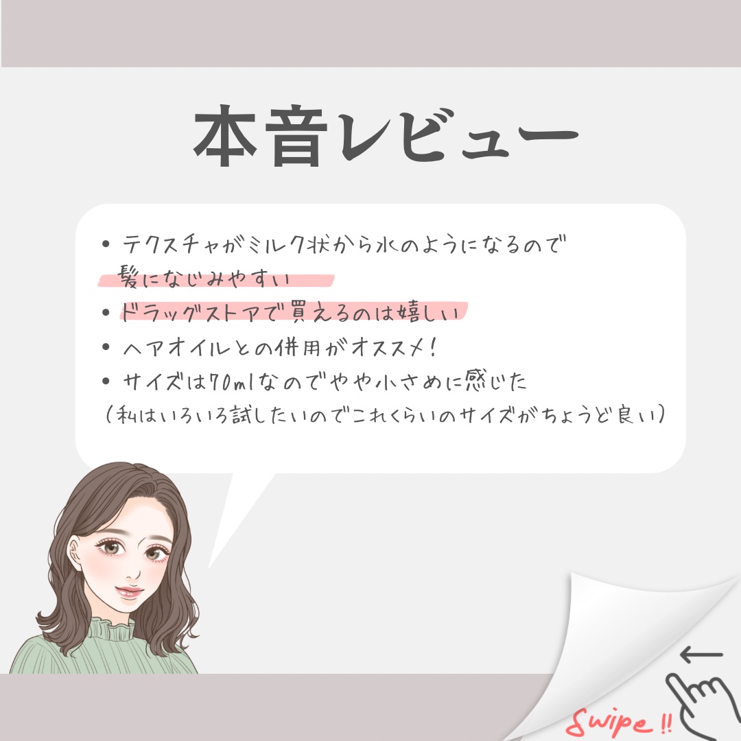 | ヘアケア・スタイリングランキング第18位 | みずみずしいテクスチャーで 髪に揉み込んだ手はサラッと🖐🏻◎まさに髪の化粧水 軽くてまとまる髪に♡ | 詳細を見る | |
