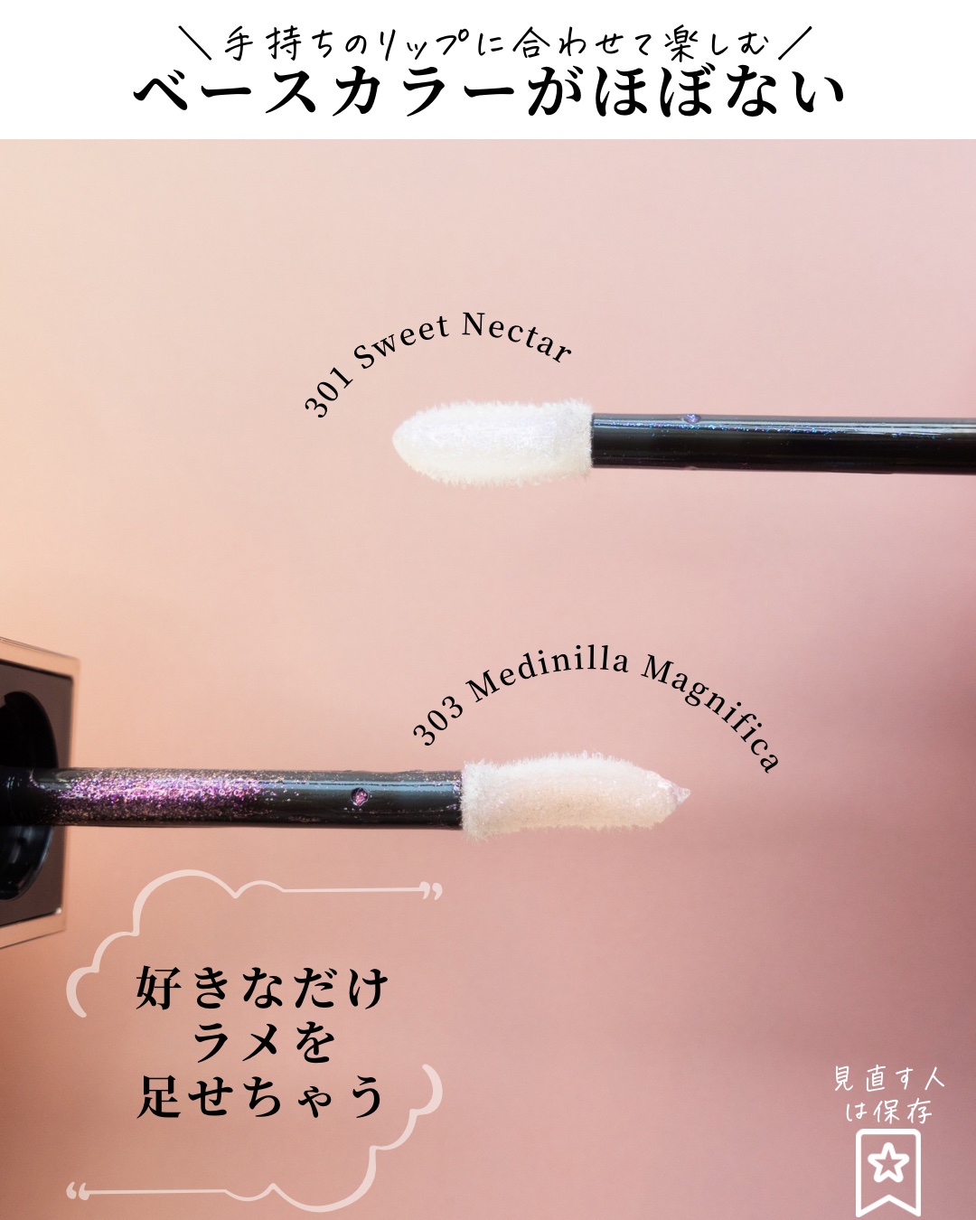 - <301 Sweet Nectar> 水添ポリイソブテン、水添ポリデセン、リンゴ酸ジイソステアリル、ジメチルシリル化シリカ、(エチレン/プロピレン/スチレン)コポリマー、ホウケイ酸(Ca/Na)、アルガニアスピノサ核油、水添レシチン、セイヨウサンザシ花エキス、テンチャエキス、(ブチレン/エチレン/スチレン)コポリマー、DPG、シリカ、t-ブチルメトキシジベンゾイルメタン、ステアリン酸Ca、酸化スズ、BHT、シメチコン、トコフェロール、BG、水、ステアリン酸、水酸化Al、香料、酸化チタン <302 Mokara> 水添ポリイソブテン、水添ポリデセン、リンゴ酸ジイソステアリル、ジメチルシリル化シリカ、(エチレン/プロピレン/スチレン)コポリマー、アルガニアスピノサ核油、水添レシチン、セイヨウサンザシ花エキス、テンチャエキス、(ブチレン/エチレン/スチレン)コポリマー、DPG、t-ブチルメトキシジベンゾイルメタン、ステアリン酸Ca、BHT、シメチコン、トコフェロール、酸化スズ、BG、水、ステアリン酸、水酸化Al、香料、合成金雲母、酸化チタン、マイカ、酸化鉄 <303 Medinilla Magnifica> 水添ポリイソブテン、水添ポリデセン、リンゴ酸ジイソステアリル、ジメチルシリル化シリカ、(エチレン/プロピレン/スチレン)コポリマー、アルガニアスピノサ核油、水添レシチン、セイヨウサンザシ花エキス、テンチャエキス、(ブチレン/エチレン/スチレン)コポリマー、DPG、t-ブチルメトキシジベンゾイルメタン、ステアリン酸Ca、BHT、シメチコン、トコフェロール、酸化スズ、BG、水、ステアリン酸、水酸化Al、香料、合成金雲母、酸化チタン、マイカ、酸化鉄 <304 Ohia Lehua> 水添ポリイソブテン、水添ポリデセン、リンゴ酸ジイソステアリル、ジメチルシリル化シリカ、(エチレン/プロピレン/スチレン)コポリマー、ホウケイ酸(Ca/Na)、アルガニアスピノサ核油、水添レシチン、セイヨウサンザシ花エキス、テンチャエキス、(ブチレン/エチレン/スチレン)コポリマー、シリカ、DPG、t-ブチルメトキシジベンゾイルメタン、ステアリン酸Ca、酸化スズ、BHT、シメチコン、トコフェロール、BG、水、ステアリン酸、水酸化Al、香料、酸化チタン、酸化鉄