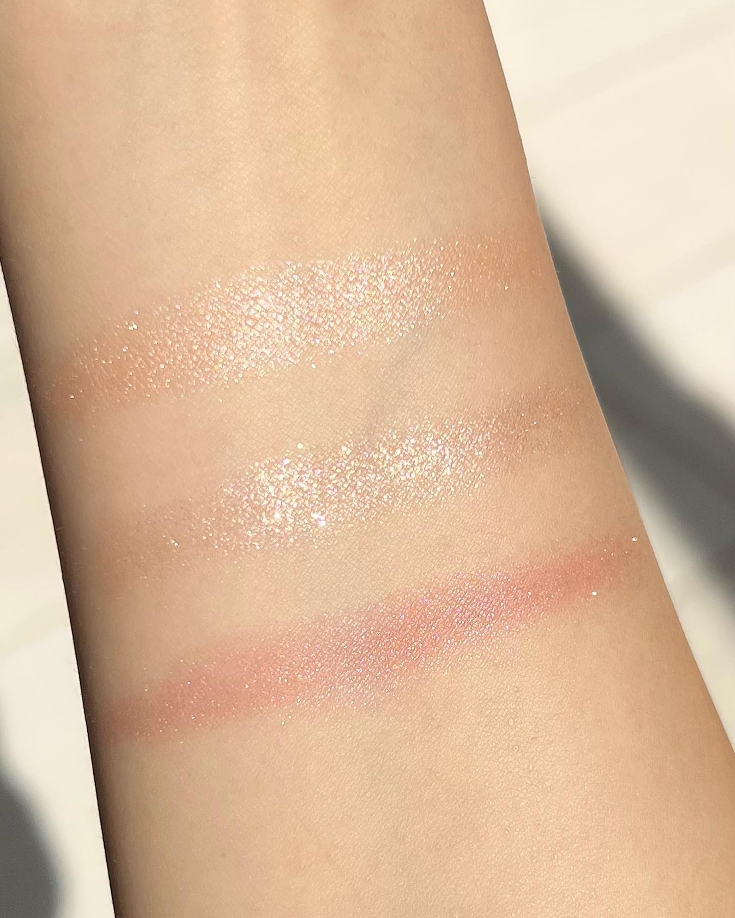 右上のピンクラメをベースに仕込んでメイクしたんだけどツヤと煌めき感えぐすぎる😳💎可愛い、、 そこに右下のカラーを重ねるとじんわり血色感が滲み出るような目元になるよ🦩 これは欠品店舗続出しそう🫣