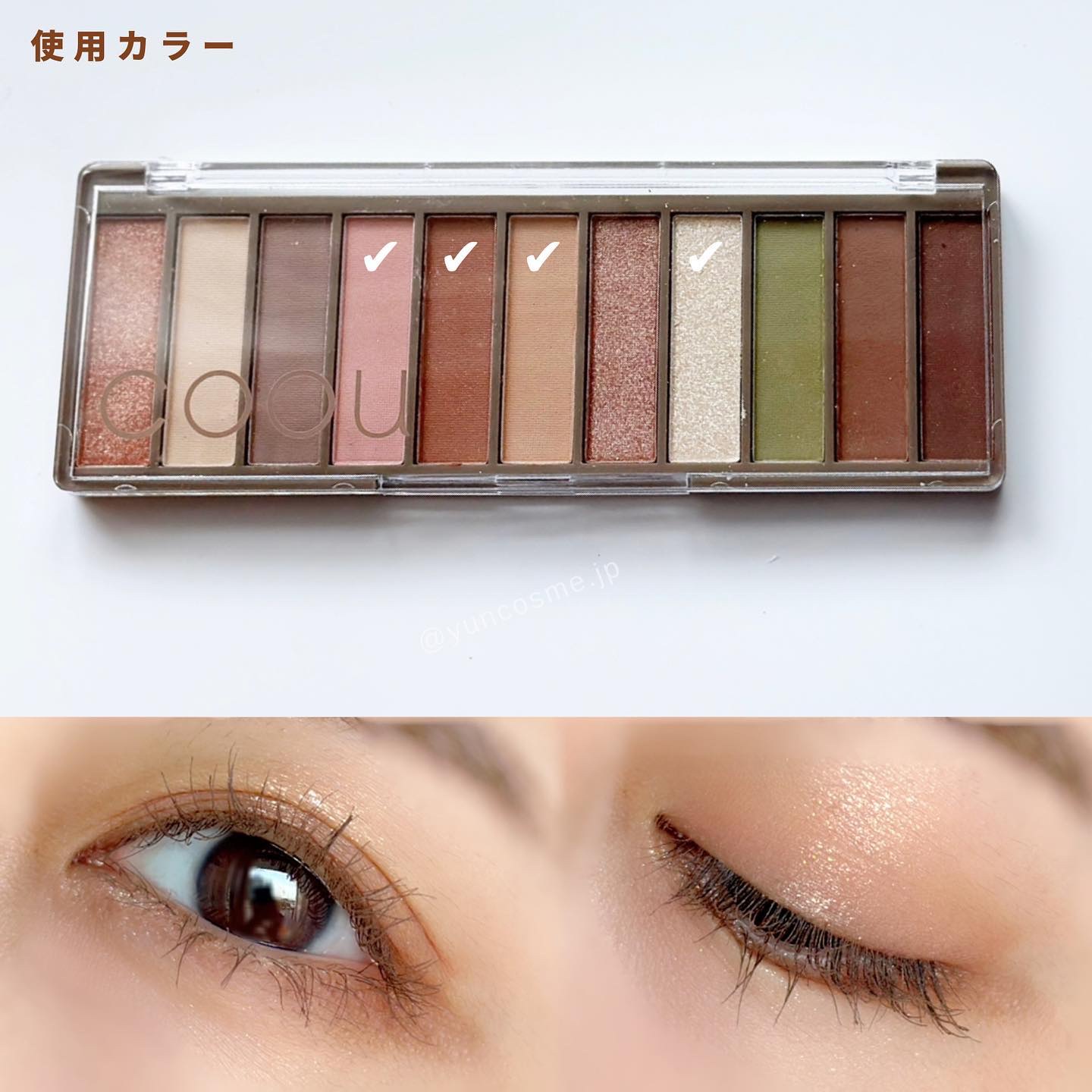 アイシャドウはマットカラー多めで落ち着きがあると思いきや、 左上のキラキラがとっても綺麗で一気におしゃれ見えする🤎✨ プチプラとは思えない質感と発色でとっても使いやすいよ☺️ チークは落ち着いたブラウンローズカラーで大人っぽい リップはほんのり赤みを感じるブラウンで透け感もあるよ🤍 ティント並みと色もちの良さ!というほどではないけど 食事とかしなければ色もちは良い🥰 ただ、なめらかなテクスチャーでしっとり感もあるんだけど わたしは長時間つけていると少し乾燥する気がしたのでその辺は個人差があるかも🙏 どのカラーもとっても可愛くておすすめだよ🫶💓