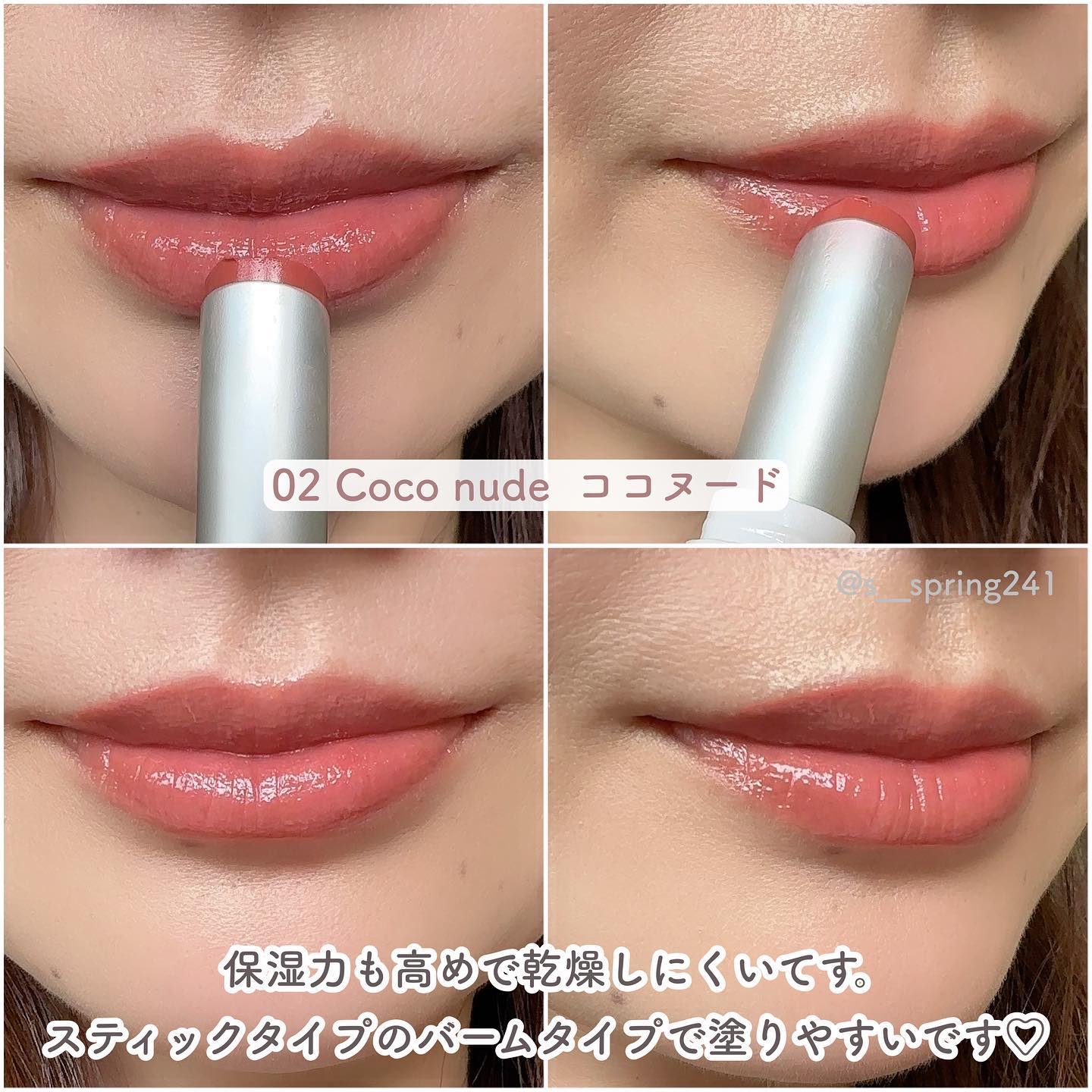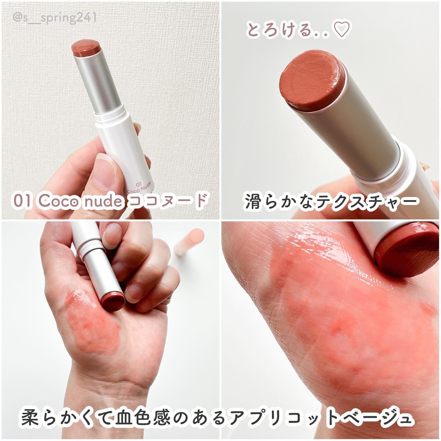 - もちっとした水膜で弾けそうなツヤリップ 1.軽い塗り心地のなめらかで透明な水爆弾ツヤ 2.塗った瞬間から唇を鮮やかに彩る多彩なカラーバーム 3.植物性保湿オイルでしっとりもっちり保湿バーム