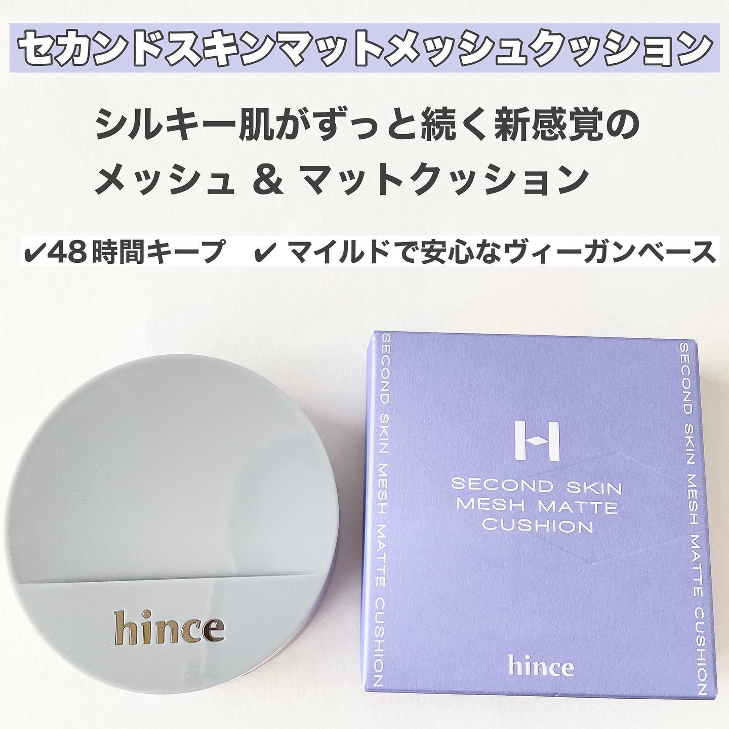 hinceセカンドスキンメッシュマットクッション 23マットに仕上がり軽いファンデ買ってみました❗マットなんだけどサラっと軽くて付け心地が良かったです‼素肌を綺麗に見せてくれて、薄いシミは隠れちゃうからなかなか優秀な印象です✨高カバーではない...